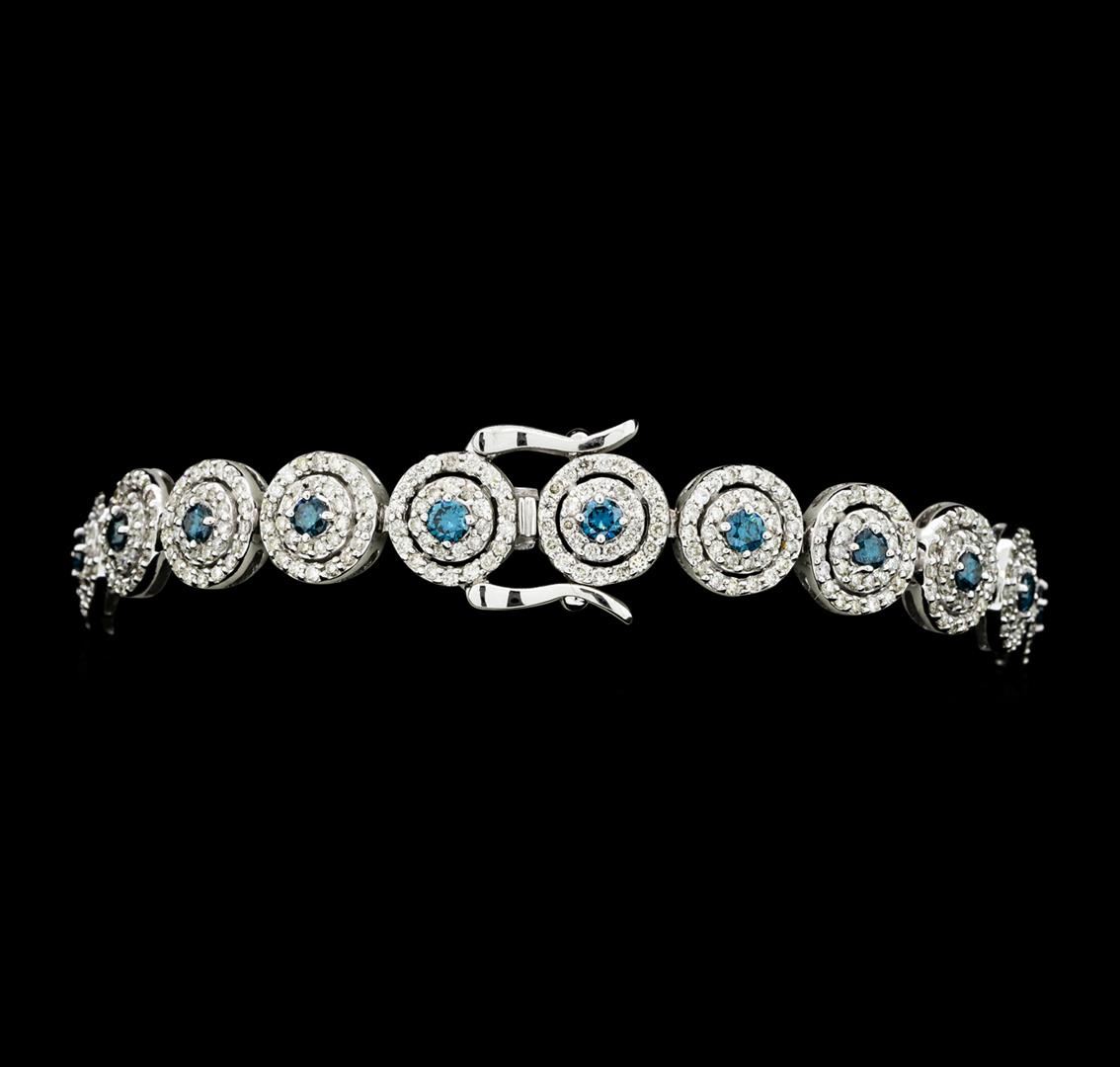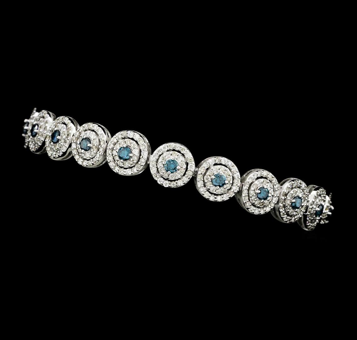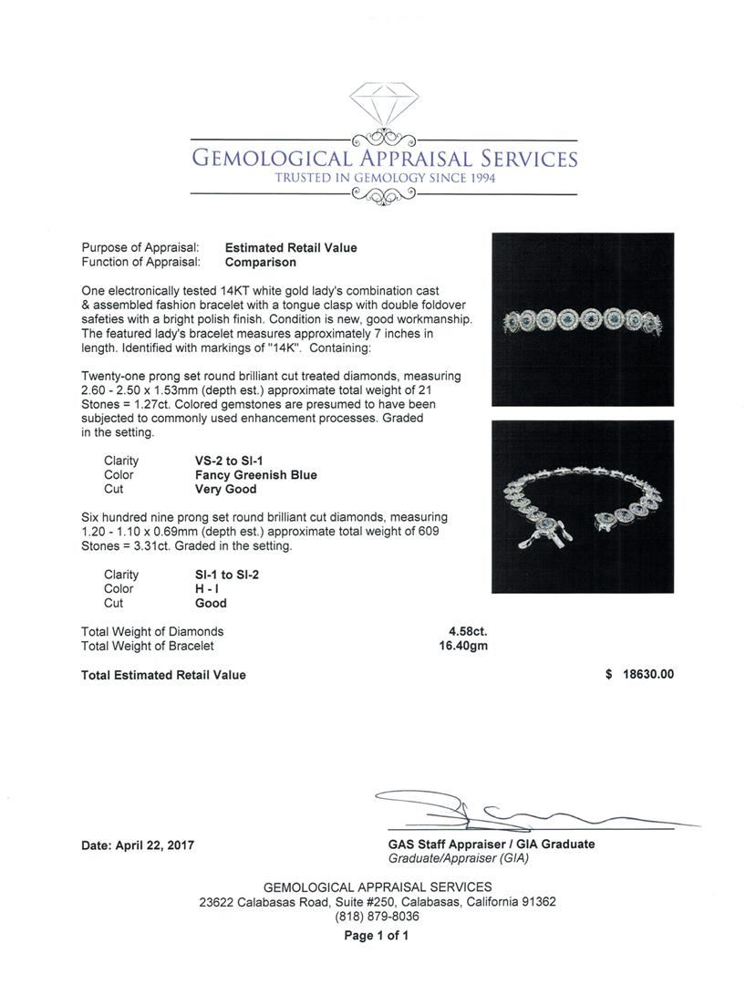 One electronically tested 14KT white gold lady's combination cast & assembled fashion bracelet with a tongue clasp with double foldover safeties with a bright polish finish. The featured lady's bracelet measures approximately 7 inches in length. Identified with markings of '14K'. Condition is new, good workmanship. Containing: Twenty-One prong set round brilliant cut treated diamonds, measuring 2.60 - 2.50 x 1.53mm (depth est.) approximate total weight of 21 Stones = 1.27ct. Colored gemstones are presumed to have been subjected to commonly used enhancement processes. Graded in the setting. Color Fancy Greenish Blue Clarity VS-2 to SI-1 Cut Very Good Six Hundred Nine prong set round brilliant cut diamonds, measuring 1.20 - 1.10 x 0.69mm (depth est.) approximate total weight of 609 Stones = 3.31ct. Graded in the setting. Color H - I Clarity SI-1 to SI-2 Cut Good. Total Weight of Diamonds 4.58ct.. Total Weight of Bracelet 16.40gm GAS Appraised at $18630.00. GAS Appraised at $18,630.00.