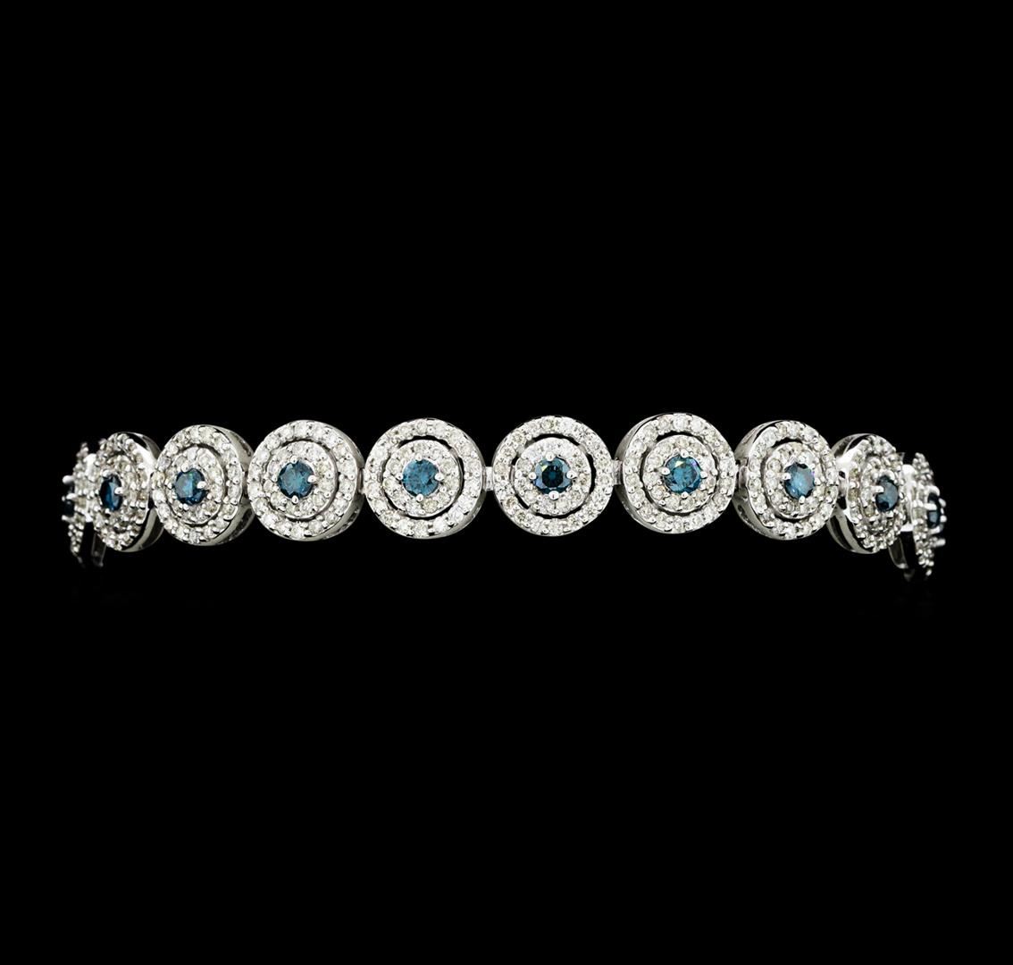 One electronically tested 14KT white gold lady's combination cast & assembled fashion bracelet with a tongue clasp with double foldover safeties with a bright polish finish. The featured lady's bracelet measures approximately 7 inches in length. Identified with markings of '14K'. Condition is new, good workmanship. Containing: Twenty-One prong set round brilliant cut treated diamonds, measuring 2.60 - 2.50 x 1.53mm (depth est.) approximate total weight of 21 Stones = 1.27ct. Colored gemstones are presumed to have been subjected to commonly used enhancement processes. Graded in the setting. Color Fancy Greenish Blue Clarity VS-2 to SI-1 Cut Very Good Six Hundred Nine prong set round brilliant cut diamonds, measuring 1.20 - 1.10 x 0.69mm (depth est.) approximate total weight of 609 Stones = 3.31ct. Graded in the setting. Color H - I Clarity SI-1 to SI-2 Cut Good. Total Weight of Diamonds 4.58ct.. Total Weight of Bracelet 16.40gm GAS Appraised at $18630.00. GAS Appraised at $18,630.00.