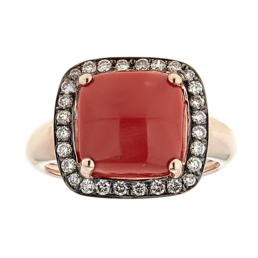 One Lady's Coral and Diamond Ring. Setting: 14 Kt. Rose Gold Mounting. Additional: 28 Round Diamonds = 0.40 Cts. TWT (Light Brown/VS-SI). Center Gem Stone Information: Species: Natural Color. Variety: Coral. Shape and Cut: Cabochon. Measurements: 10.32 x 10.20 x 3.83 +/- mm. Weight: 4.58 Carats. Transparency: Opaque. Color Hue: Reddish Orange. Saturation: Moderate. Total Weight: 3.5 grams.
