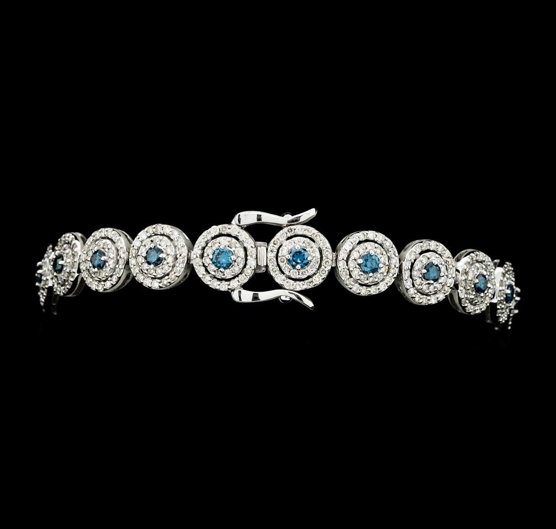 One electronically tested 14KT white gold lady's combination cast & assembled fashion bracelet with a tongue clasp with double foldover safeties with a bright polish finish. The featured lady's bracelet measures approximately 7 inches in length. Identified with markings of '14K'. Condition is new, good workmanship. Containing: Twenty-One prong set round brilliant cut treated diamonds, measuring 2.60 - 2.50 x 1.53mm (depth est.) approximate total weight of 21 Stones = 1.27ct. Colored gemstones are presumed to have been subjected to commonly used enhancement processes. Graded in the setting. Color Fancy Greenish Blue Clarity VS-2 to SI-1 Cut Very Good Six Hundred Nine prong set round brilliant cut diamonds, measuring 1.20 - 1.10 x 0.69mm (depth est.) approximate total weight of 609 Stones = 3.31ct. Graded in the setting. Color H - I Clarity SI-1 to SI-2 Cut Good. Total Weight of Diamonds 4.58ct.. Total Weight of Bracelet 16.40gm GAS Appraised at $18630.00. GAS Appraised.