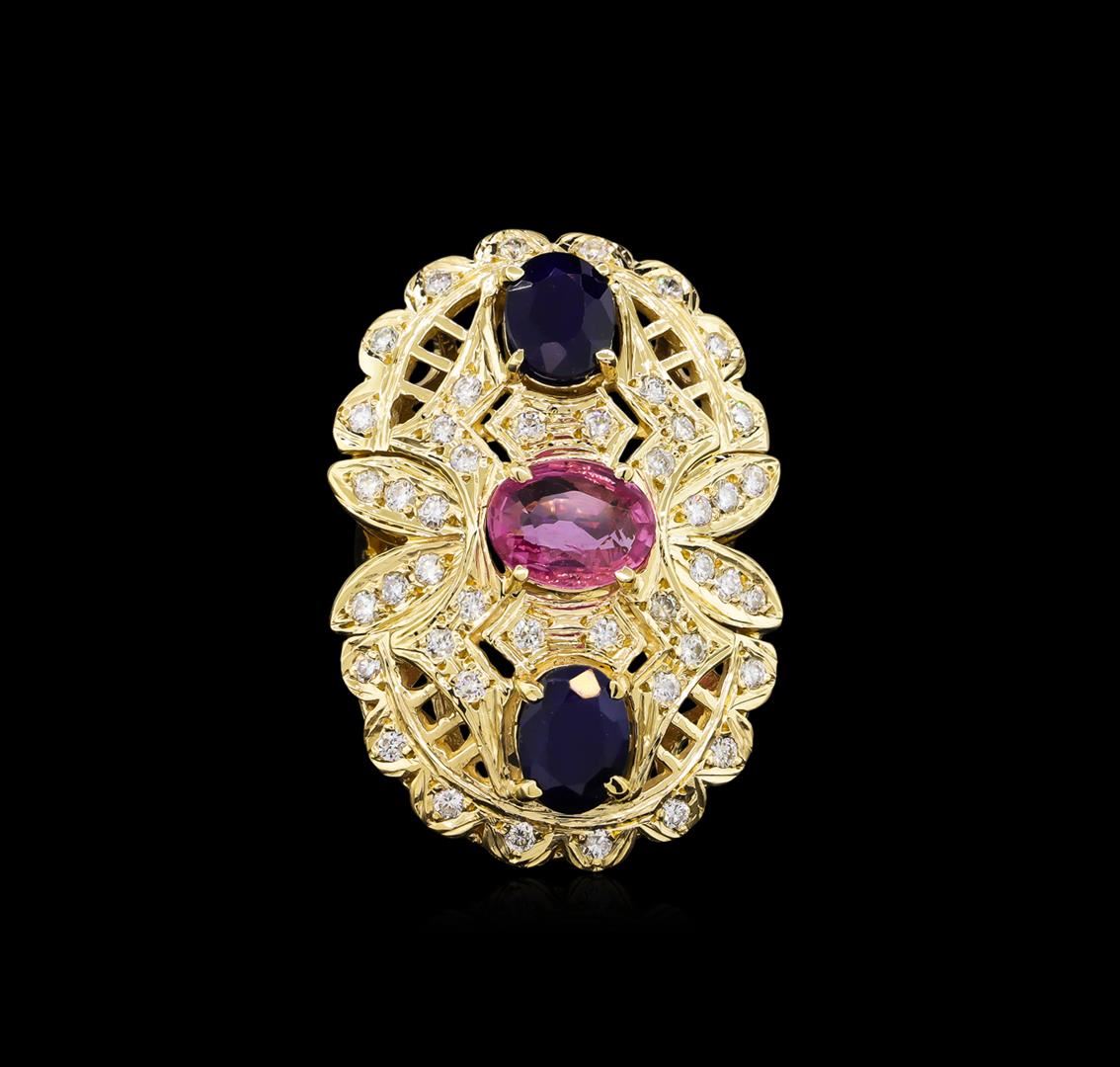 One electronically tested 14KT yellow gold ladies cast multicolor sapphire and diamond ring. The featured pink sapphire is set with two blue sapphires within an elaborate diamond gallery supported by split shoulders, completed by a two millimeter wide band. Bright polish and textured finish. Condition is new, good workmanship. Containing: One prong set oval mixed cut natural pink sapphire, measuring 9.00 x 6.70 x 2.60mm, approximate weight of 1.53ct., clarity is slightly included, medium, very slightly grayish, pink color, (GIA Pk 5/3), cut is good. Transmitting light with a minimum of distortion, transparent. Naturally occurring internal & external characteristics are present. Graded in the setting. Two prong set oval mixed cut natural blue sapphires approximate total weight of 3.05ct., clarity is heavily included, type II, dark, very slightly grayish, blue color, (GIA B 7/3), cut is good. Transmitting light somewhat diffusely, translucent. Naturally occurring internal & external characteristics are present. Indications of laboratory high temperature diffusion treatment. Color grade is an average for the pair. Graded in the setting. Forty-Four prong set round brilliant cut diamonds approximate total weight of 44 Stones = 0.92ct. Graded in the setting. Clarity: SI-1 to I-1. Color: E - G. Total Weight of Colored Stones 4.58ct. Total Weight of Diamonds 0.92ct. Total Weight of Ring 13.69gm. AIG Appraised at $8,460.00.