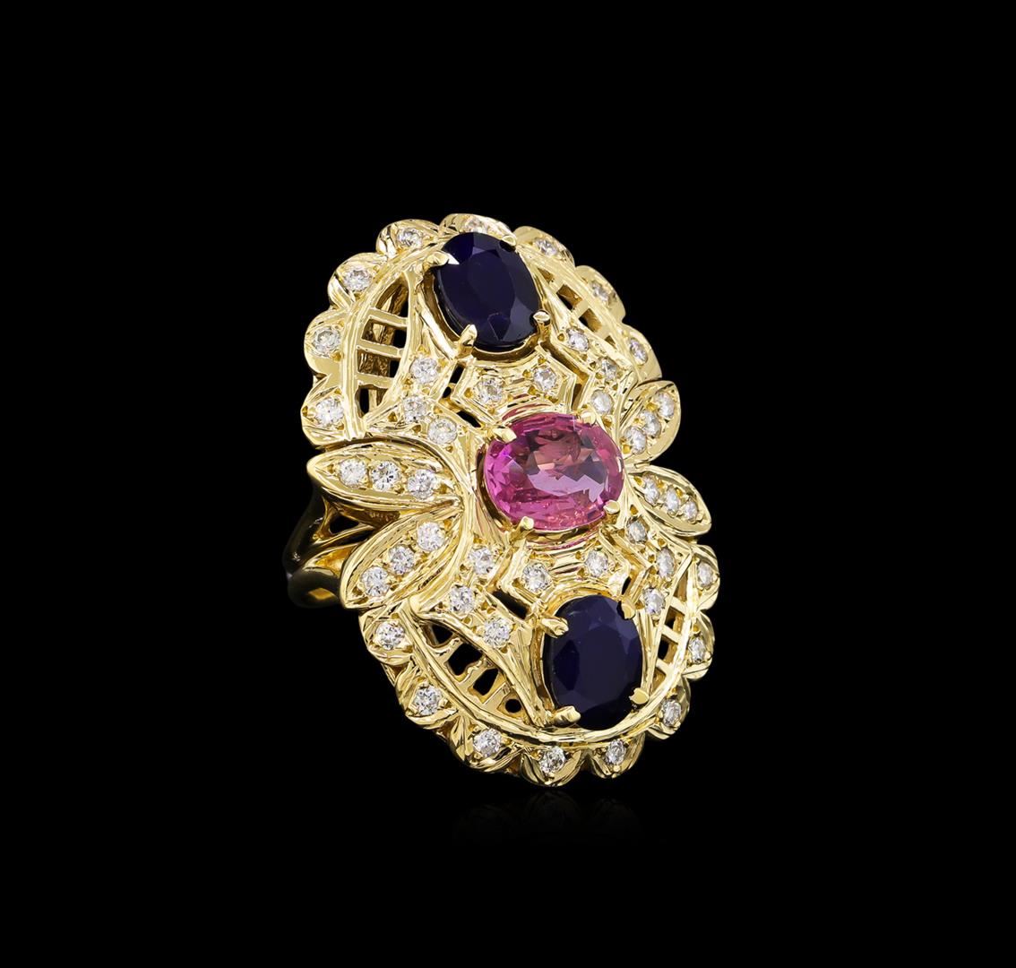 One electronically tested 14KT yellow gold ladies cast multicolor sapphire and diamond ring. The featured pink sapphire is set with two blue sapphires within an elaborate diamond gallery supported by split shoulders, completed by a two millimeter wide band. Bright polish and textured finish. Condition is new, good workmanship. Containing: One prong set oval mixed cut natural pink sapphire, measuring 9.00 x 6.70 x 2.60mm, approximate weight of 1.53ct., clarity is slightly included, medium, very slightly grayish, pink color, (GIA Pk 5/3), cut is good. Transmitting light with a minimum of distortion, transparent. Naturally occurring internal & external characteristics are present. Graded in the setting. Two prong set oval mixed cut natural blue sapphires approximate total weight of 3.05ct., clarity is heavily included, type II, dark, very slightly grayish, blue color, (GIA B 7/3), cut is good. Transmitting light somewhat diffusely, translucent. Naturally occurring internal & external characteristics are present. Indications of laboratory high temperature diffusion treatment. Color grade is an average for the pair. Graded in the setting. Forty-Four prong set round brilliant cut diamonds approximate total weight of 44 Stones = 0.92ct. Graded in the setting. Clarity: SI-1 to I-1. Color: E - G. Total Weight of Colored Stones 4.58ct. Total Weight of Diamonds 0.92ct. Total Weight of Ring 13.69gm. AIG Appraised at $8,460.00.
