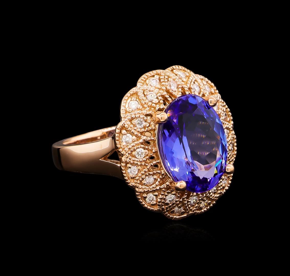 One electronically tested 14KT rose gold lady's cast fashion ring with a scalloped basket halo with a bright polish with milgrain detailing finish. The featured lady's ring has a shank measuring 2.50 millimeters wide. Identified with markings of "14K". Condition is new, good workmanship. Containing: One prong set oval modified brilliant cut natural tanzanite, measuring 12.60 x 9.80 x 5.25mm, approximate weight of 4.58ct., clarity is eye clean, type I, medium, moderately strong, violetish blue color, (GIA vB 5/4), cut is very good. Transmitting light with no distortion, transparent. Colored gemstones are presumed to have been subjected to commonly used enhancement processes. Graded in the setting. Twenty-Four prong set round brilliant cut diamonds, measuring 1.40 - 1.35 x 0.86mm (depth est.) approximate total weight of 24 Stones = 0.24ct. Graded in the setting. Clarity: SI-2 to I-1. Color: H - I. Cut Good. Total Weight of Colored Stones 4.58ct. Total Weight of Diamonds 0.24ct. Total Weight of Ring 8.10gm. GAS Appraised at $9,175.00.