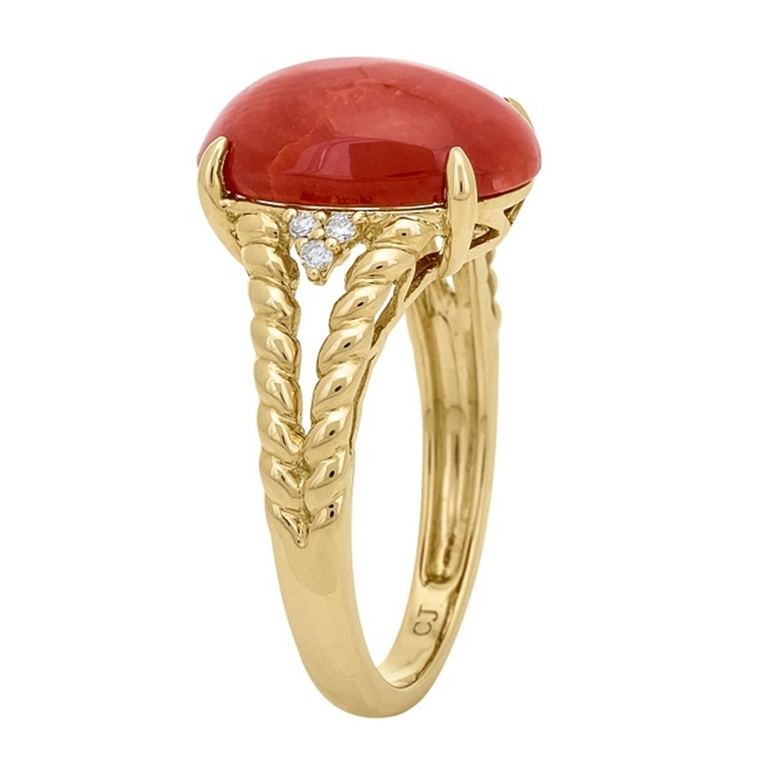 One Coral and Diamond Ring featuring: 14KT Yellow Gold with a total weight of 3.11 grams, Coral with a total weight of 4.59ct, and Six Round Cut Diamonds with a total weight of 0.05ctw.