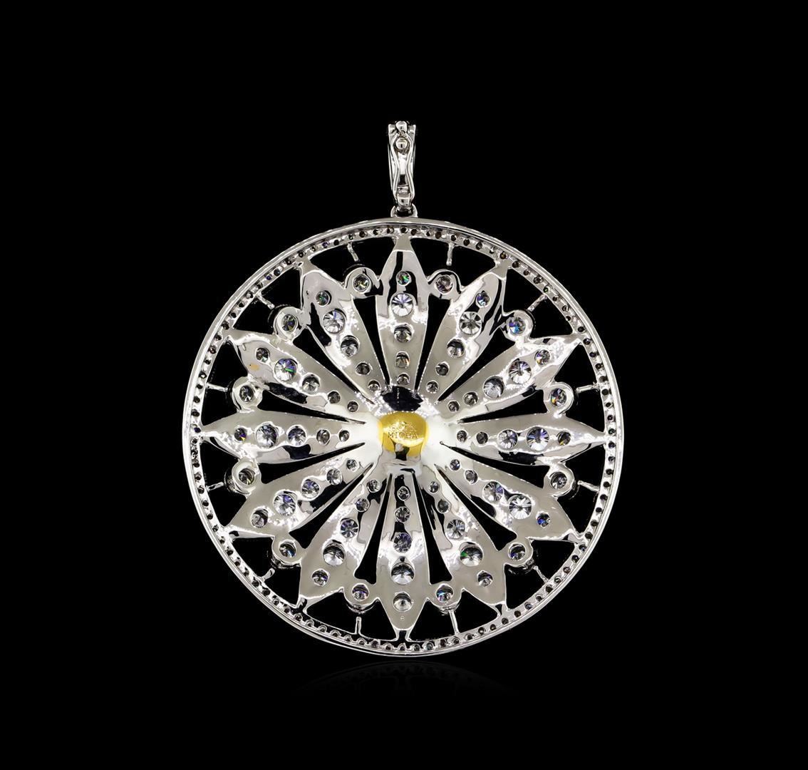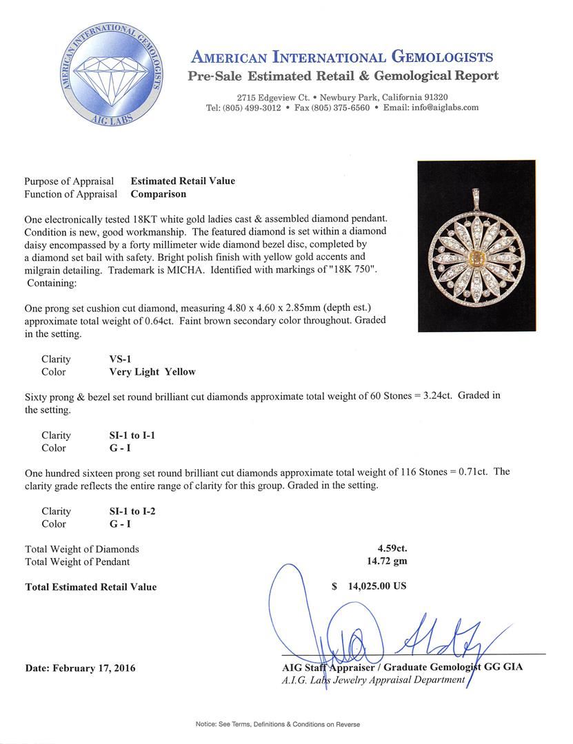 One electronically tested 18KT white gold ladies cast & assembled diamond pendant. The featured diamond is set within a diamond daisy encompassed by a forty millimeter wide diamond bezel disc, completed by a diamond set bail with safety. Bright polish finish with yellow gold accents and milgrain detailing. Trademark is MICHA. Identified with markings of "18K 750". Condition is new, good workmanship. Containing: One prong set cushion cut diamond, measuring 4.80 x 4.60 x 2.85mm (depth est.) approximate total weight of 0.64ct. Faint brown secondary color throughout. Graded in the setting. Clarity: VS-1 Sixty prong & bezel set round brilliant cut diamonds approximate total weight of 60 Stones = 3.24ct. Graded in the setting. Clarity: SI-1 to I-1. Color: G - I One Hundred Sixteen prong set round brilliant cut diamonds approximate total weight of 116 Stones = 0.71ct. The clarity grade reflects the entire range of clarity for this group. Graded in the setting. Clarity: SI-1 to I-2. Color: G - I. Total Weight of Diamonds 4.59ct. Total Weight of Pendant 14.72gm. AIG Appraised at $14,025.00.