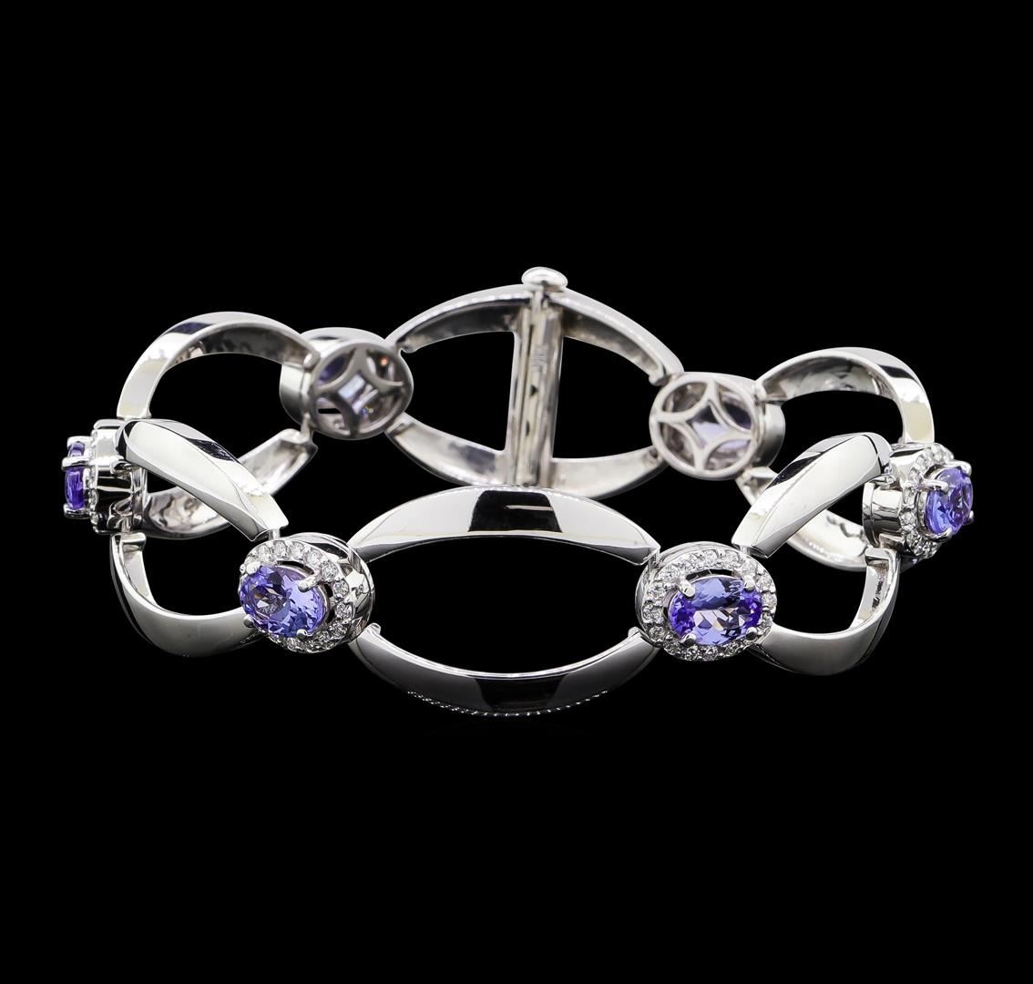 One electronically tested 14KT white gold lady's combination cast & assembled fashion bracelet with a double plunger clasp with a bright polish finish. The featured lady's bracelet has six oval tanzanites, each surrounded by a halo and connected by opposing crescent shaped bars. The bracelet measures approximately 7 inches in length. Identified with markings of 'K14'. Condition is new, good workmanship. Containing: Six prong set oval modified brilliant cut natural tanzanites, measuring 7.05 x 5.10 x 3.20mm, (depth est.) approximate total weight of 4.60 ct., clarity is eye clean, medium light, very slightly grayish, violet color, (GIA V 4/3), cut is good. Transmitting light with no distortion, transparent. Colored gemstones are presumed to have been subjected to commonly used enhancement processes. Graded in the setting. Ninety-Six prong set round brilliant cut diamonds, measuring 1.40 - 1.35 x 0.86mm (depth est.) approximate total weight of 96 Stones = 0.96ct. Graded in the setting. Clarity SI-1 to SI-2. Color: H - I Cut Good. Total Weight of Colored Stones 4.60 ct.. Total Weight of Diamonds 0.96ct.. Total Weight of Bracelet 25.20gm. GAS Appraised.