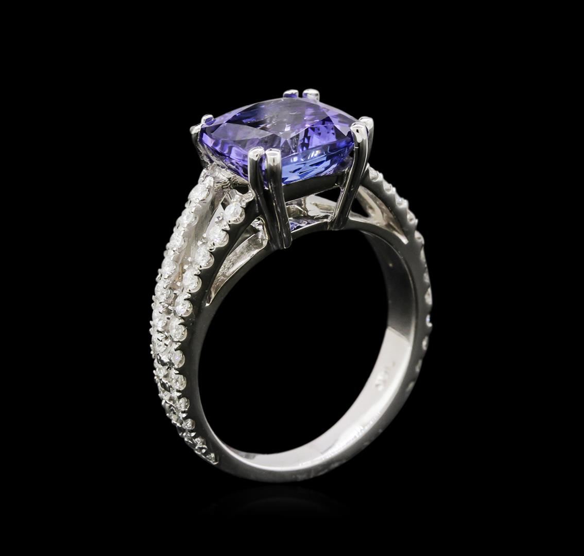 One electronically tested 14KT white gold lady's cast fashion ring with a cathedral split shank with a bright polish finish. The featured lady's ring has a shank measuring 2.88 millimeters wide. Identified with markings of "14K". Condition is new, good workmanship. Containing: One prong set square cushion modified brilliant cut natural tanzanite, measuring 9.42 x 9.26 x 6.40mm, 5%. bulge factor, approximate weight of 4.60ct., clarity is eye clean, type I, medium light, moderately strong, bluish violet color, (GIA bV 4/4), cut is very good. Transmitting light with no distortion, transparent. Colored gemstones are presumed to have been subjected to commonly used enhancement processes. Graded in the setting. Forty-Eight prong set round brilliant cut diamonds, measuring 1.60 - 1.50 x 0.96mm (depth est.) approximate total weight of 48 Stones = 0.68ct. Graded in the setting. Clarity: SI-1 to I-1. Color: G - Good. Total Weight of Colored Stones 4.60ct. Total Weight of Diamonds 0.68ct. Total Weight of Ring 6.20gm. GAS Appraised at $8,660.00.