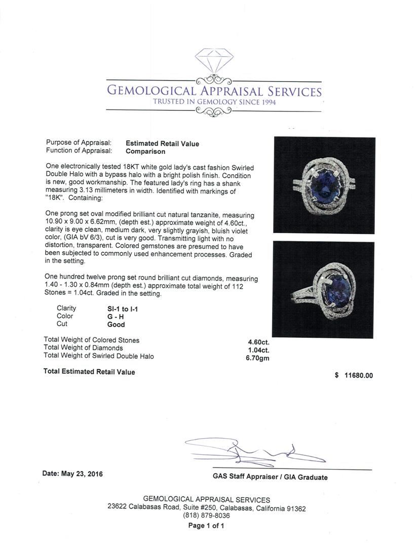 One electronically tested 18KT white gold lady's cast fashion Swirled Double Halo with a bypass halo with a bright polish finish. The featured lady's ring has a shank measuring 3.13 millimeters in width. Identified with markings of "18K". Condition is new, good workmanship. Containing: One prong set oval modified brilliant cut natural tanzanite, measuring 10.90 x 9.00 x 6.62mm, (depth est.) approximate weight of 4.60ct., clarity is eye clean, medium dark, very slightly grayish, bluish violet color, (GIA bV 6/3), cut is very good. Transmitting light with no distortion, transparent. Colored gemstones are presumed to have been subjected to commonly used enhancement processes. Graded in the setting. One Hundred Twelve prong set round brilliant cut diamonds, measuring 1.40 - 1.30 x 0.84mm (depth est.) approximate total weight of 112 Stones = 1.04ct. Graded in the setting. Clarity: SI-1 to I-1. Color: G - Good. Total Weight of Colored Stones 4.60ct. Total Weight of Diamonds 1.04ct. Total Weight of Swirled Double Halo 6.70gm. GAS Appraised at $11,680.00.