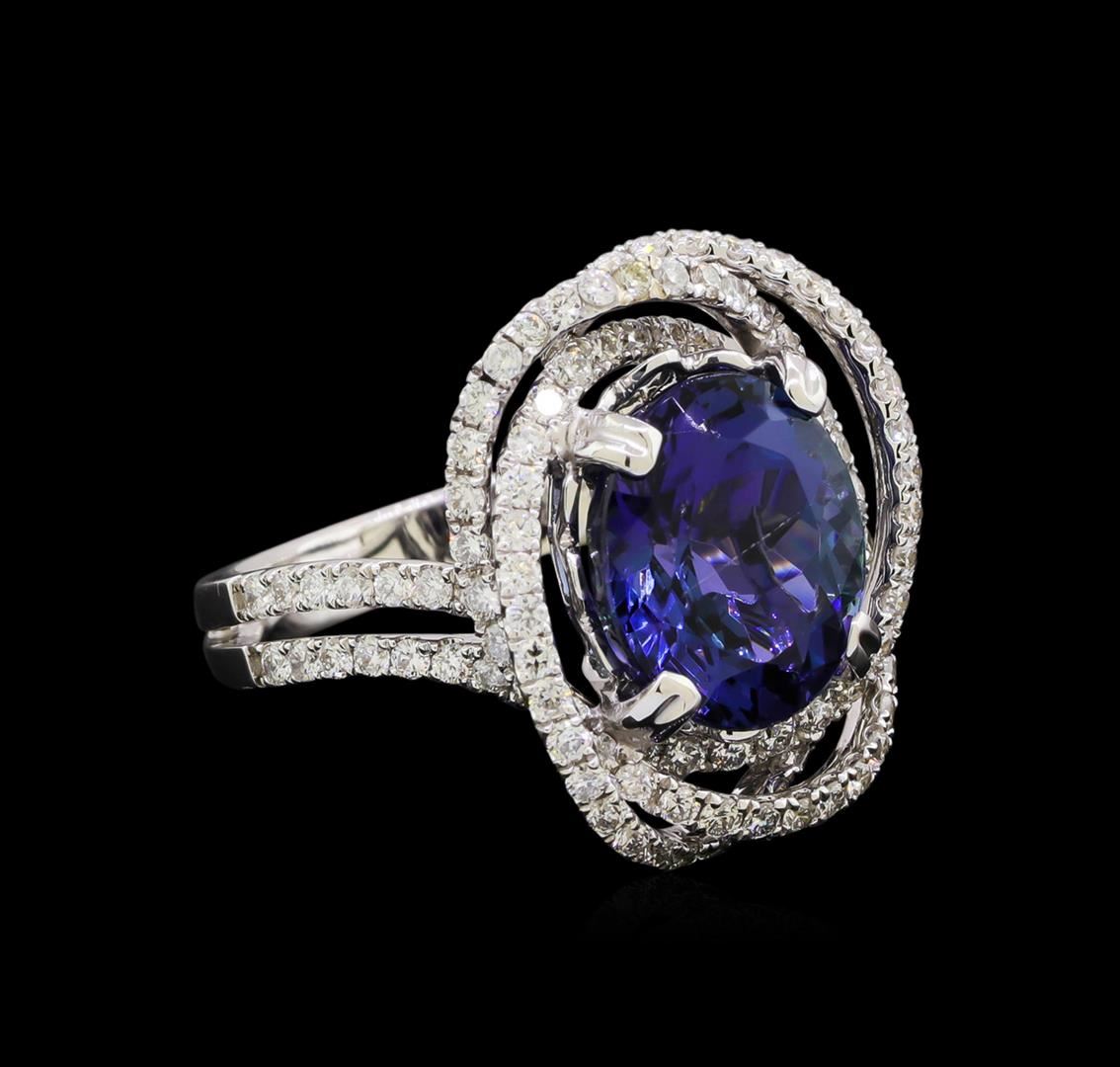 One electronically tested 18KT white gold lady's cast fashion Swirled Double Halo with a bypass halo with a bright polish finish. The featured lady's ring has a shank measuring 3.13 millimeters in width. Identified with markings of "18K". Condition is new, good workmanship. Containing: One prong set oval modified brilliant cut natural tanzanite, measuring 10.90 x 9.00 x 6.62mm, (depth est.) approximate weight of 4.60ct., clarity is eye clean, medium dark, very slightly grayish, bluish violet color, (GIA bV 6/3), cut is very good. Transmitting light with no distortion, transparent. Colored gemstones are presumed to have been subjected to commonly used enhancement processes. Graded in the setting. One Hundred Twelve prong set round brilliant cut diamonds, measuring 1.40 - 1.30 x 0.84mm (depth est.) approximate total weight of 112 Stones = 1.04ct. Graded in the setting. Clarity: SI-1 to I-1. Color: G - Good. Total Weight of Colored Stones 4.60ct. Total Weight of Diamonds 1.04ct. Total Weight of Swirled Double Halo 6.70gm. GAS Appraised at $11,680.00.