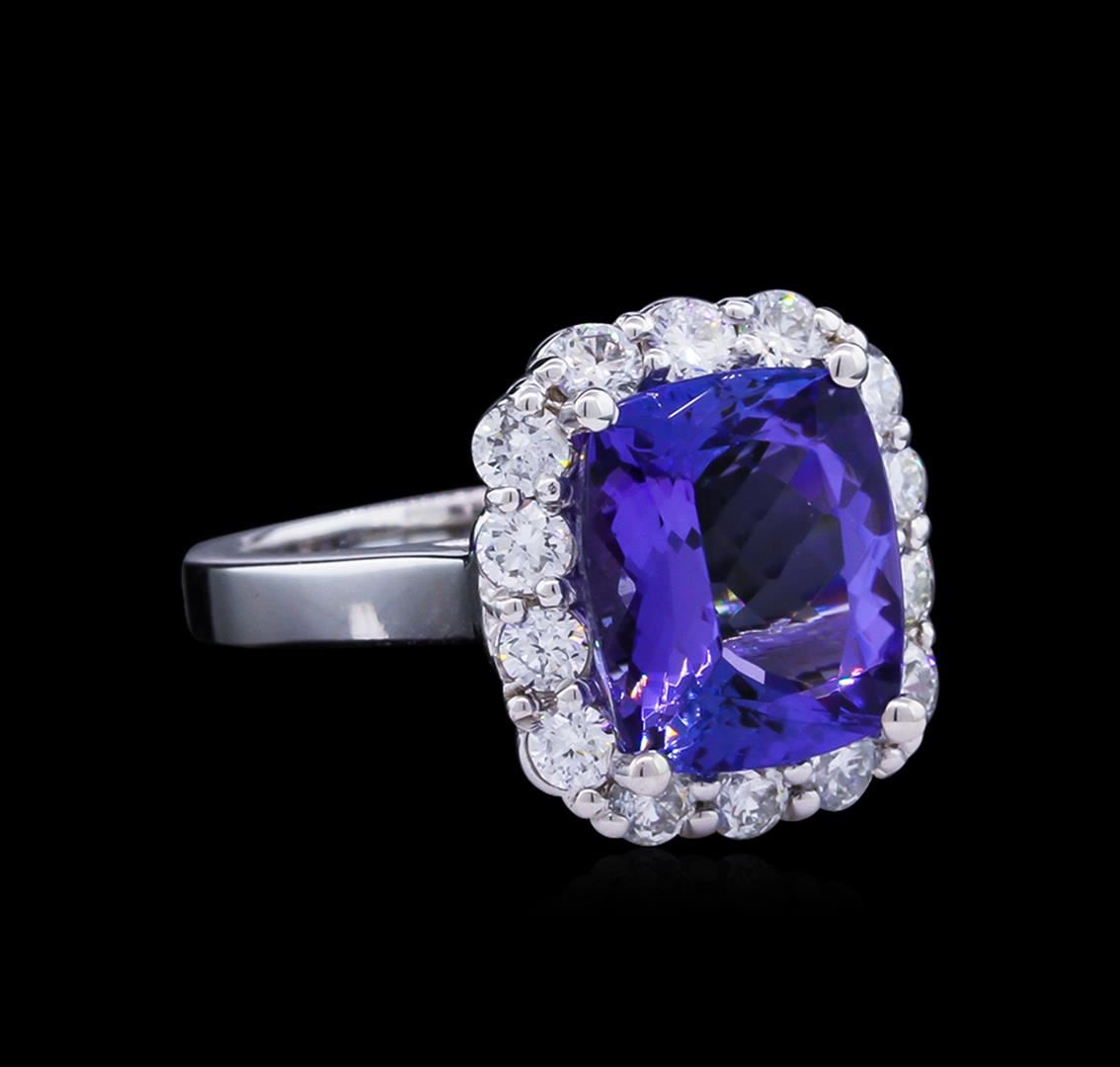 One electronically tested 14KT white gold lady's cast fashion ring with a halo with a bright polish finish. The featured lady's ring has a shank measuring 2.21 millimeters wide. Identified with markings of "14K". Condition is new, good workmanship. Containing: One prong set rectangular cushion modified brilliant cut natural tanzanite, measuring 10.69 x 8.89 x 5.85mm, 5%. bulge factor, approximate weight of 4.60ct., clarity is eye clean, type I, medium dark, moderately strong, violetish blue color, (GIA vB 6/4), cut is very good. Transmitting light with no distortion, transparent. Colored gemstones are presumed to have been subjected to commonly used enhancement processes. Graded in the setting. Fourteen prong set round brilliant cut diamonds, measuring 2.60 - 2.50 x 1.61mm (depth est.) approximate total weight of 14 Stones = 0.89ct. Graded in the setting. Clarity: SI-1 to SI-2. Color: H - I. Cut Good. Total Weight of Colored Stones 4.60ct. Total Weight of Diamonds 0.89ct. Total Weight of Ring 6.30gm. GAS Appraised at $10,705.00.