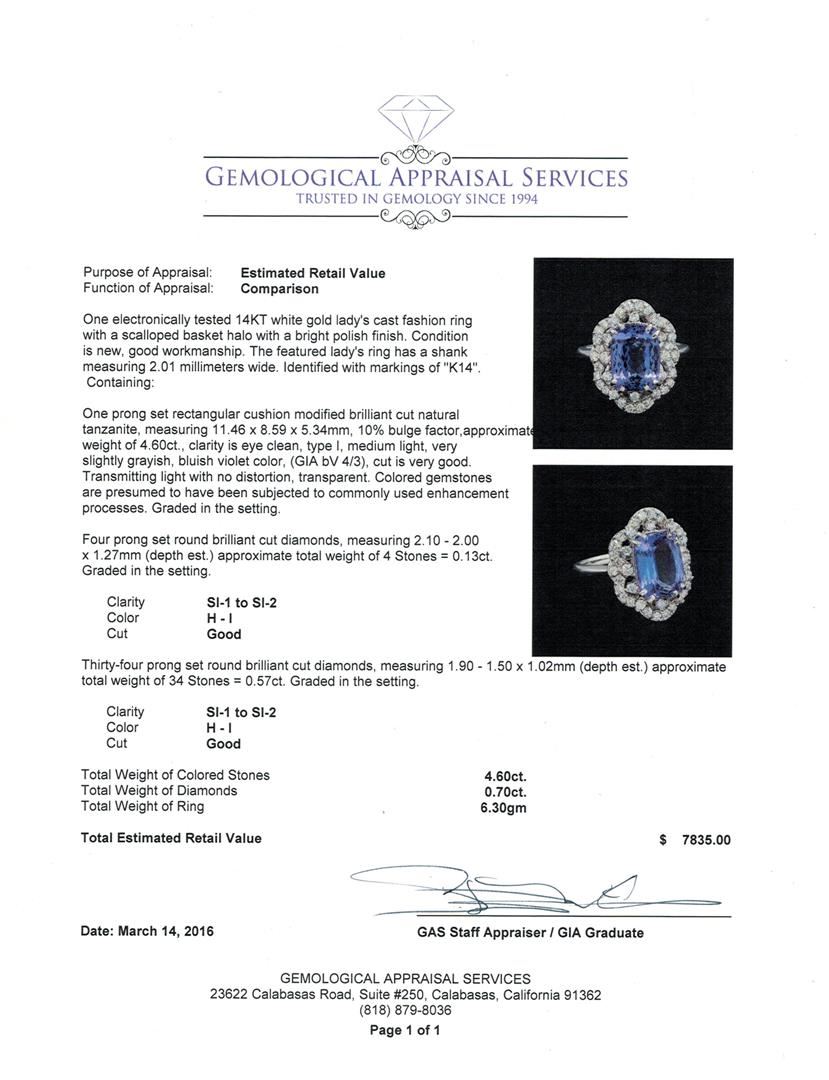 One electronically tested 14KT white gold lady's cast fashion ring with a scalloped basket halo with a bright polish finish. The featured lady's ring has a shank measuring 2.01 millimeters wide. Identified with markings of "K14". Condition is new, good workmanship. Containing: One prong set rectangular cushion modified brilliant cut natural tanzanite, measuring 11.46 x 8.59 x 5.34mm, 10%. bulge factor, approximate weight of 4.60ct., clarity is eye clean, type I, medium light, very slightly grayish, bluish violet color, (GIA bV 4/3), cut is very good. Transmitting light with no distortion, transparent. Colored gemstones are presumed to have been subjected to commonly used enhancement processes. Graded in the setting. Four prong set round brilliant cut diamonds, measuring 2.10 - 2.00 x 1.27mm (depth est.) approximate total weight of 4 Stones = 0.13ct. Graded in the setting. Clarity: SI-1 to SI-2. Color: H - I. Cut Good Thirty-Four prong set round brilliant cut diamonds, measuring 1.90 - 1.50 x 1.02mm (depth est.) approximate total weight of 34 Stones = 0.57ct. Graded in the setting. Clarity: SI-1 to SI-2. Color: H - I. Cut Good. Total Weight of Colored Stones 4.60ct. Total Weight of Diamonds 0.70ct. Total Weight of Ring 6.30gm. GAS Appraised at $7,835.00.