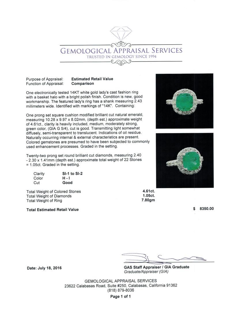 One electronically tested 14KT white gold lady's cast fashion ring with a basket halo with a bright polish finish. The featured lady's ring has a shank measuring 2.43 millimeters wide. Identified with markings of '14K'. Condition is new, good workmanship. Containing: One prong set square cushion modified brilliant cut natural emerald, measuring 10.28 x 9.97 x 8.02mm, (depth est.) approximate weight of 4.61ct., clarity is heavily included, medium, moderately strong, green color, (GIA G 5/4), cut is good. Transmitting light somewhat diffusely, semi-transparent to translucent. Indications of oil residue. Naturally occurring internal & external characteristics are present. Colored gemstones are presumed to have been subjected to commonly used enhancement processes. Graded in the setting. Twenty-Two prong set round brilliant cut diamonds, measuring 2.40 - 2.30 x 1.41mm (depth est.) approximate total weight of 22 Stones = 1.05ct. Graded in the setting. Clarity SI-1 to SI-2. Color: H - I Cut Good. Total Weight of Colored Stones 4.61ct.. Total Weight of Diamonds 1.05ct.. Total Weight of Ring 7.80gm. GAS Appraised at $8,350.00.