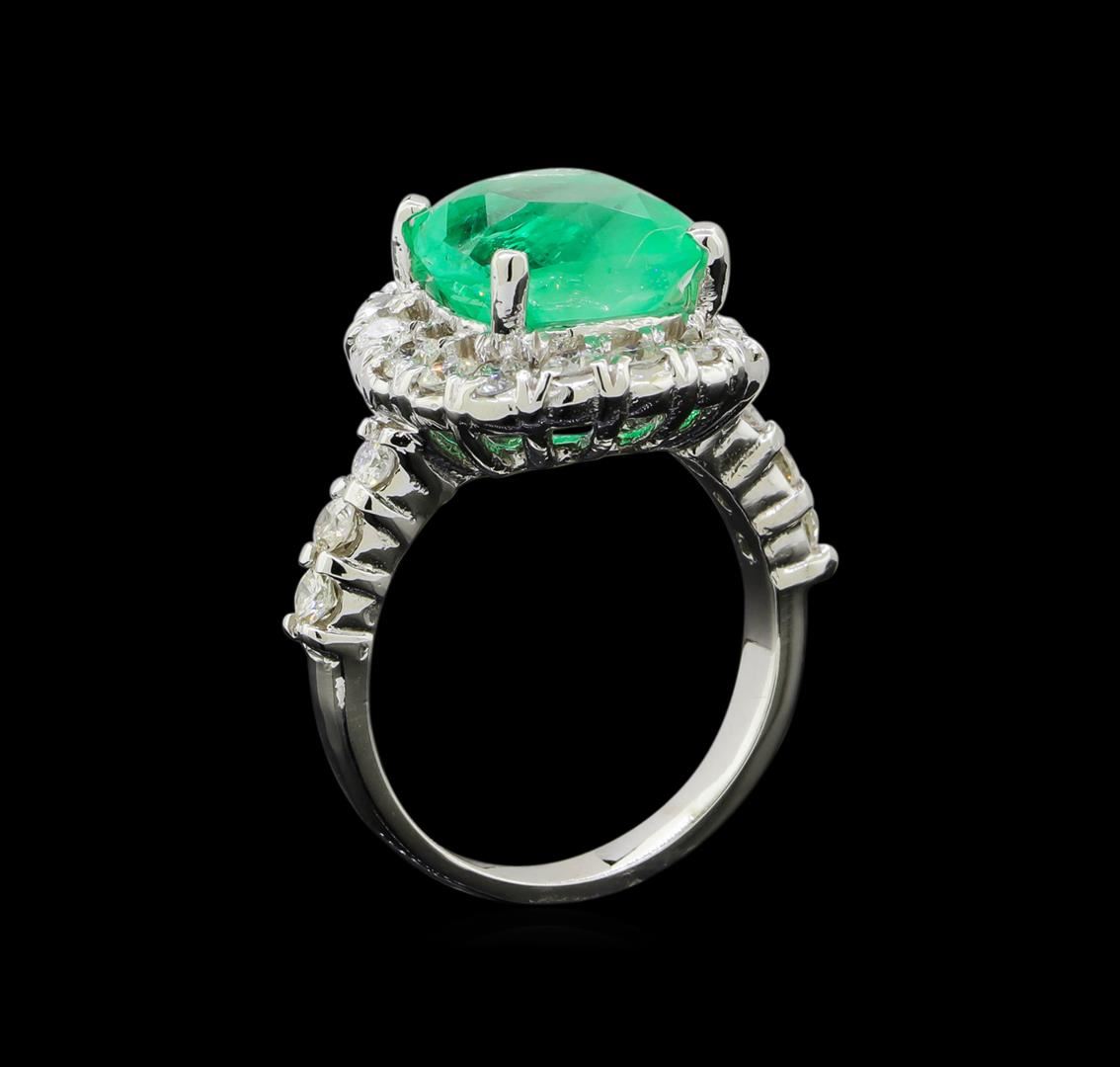 One electronically tested 14KT white gold lady's cast fashion ring with a basket halo with a bright polish finish. The featured lady's ring has a shank measuring 2.43 millimeters wide. Identified with markings of '14K'. Condition is new, good workmanship. Containing: One prong set square cushion modified brilliant cut natural emerald, measuring 10.28 x 9.97 x 8.02mm, (depth est.) approximate weight of 4.61ct., clarity is heavily included, medium, moderately strong, green color, (GIA G 5/4), cut is good. Transmitting light somewhat diffusely, semi-transparent to translucent. Indications of oil residue. Naturally occurring internal & external characteristics are present. Colored gemstones are presumed to have been subjected to commonly used enhancement processes. Graded in the setting. Twenty-Two prong set round brilliant cut diamonds, measuring 2.40 - 2.30 x 1.41mm (depth est.) approximate total weight of 22 Stones = 1.05ct. Graded in the setting. Clarity SI-1 to SI-2. Color: H - I Cut Good. Total Weight of Colored Stones 4.61ct.. Total Weight of Diamonds 1.05ct.. Total Weight of Ring 7.80gm. GAS Appraised at $8,350.00.