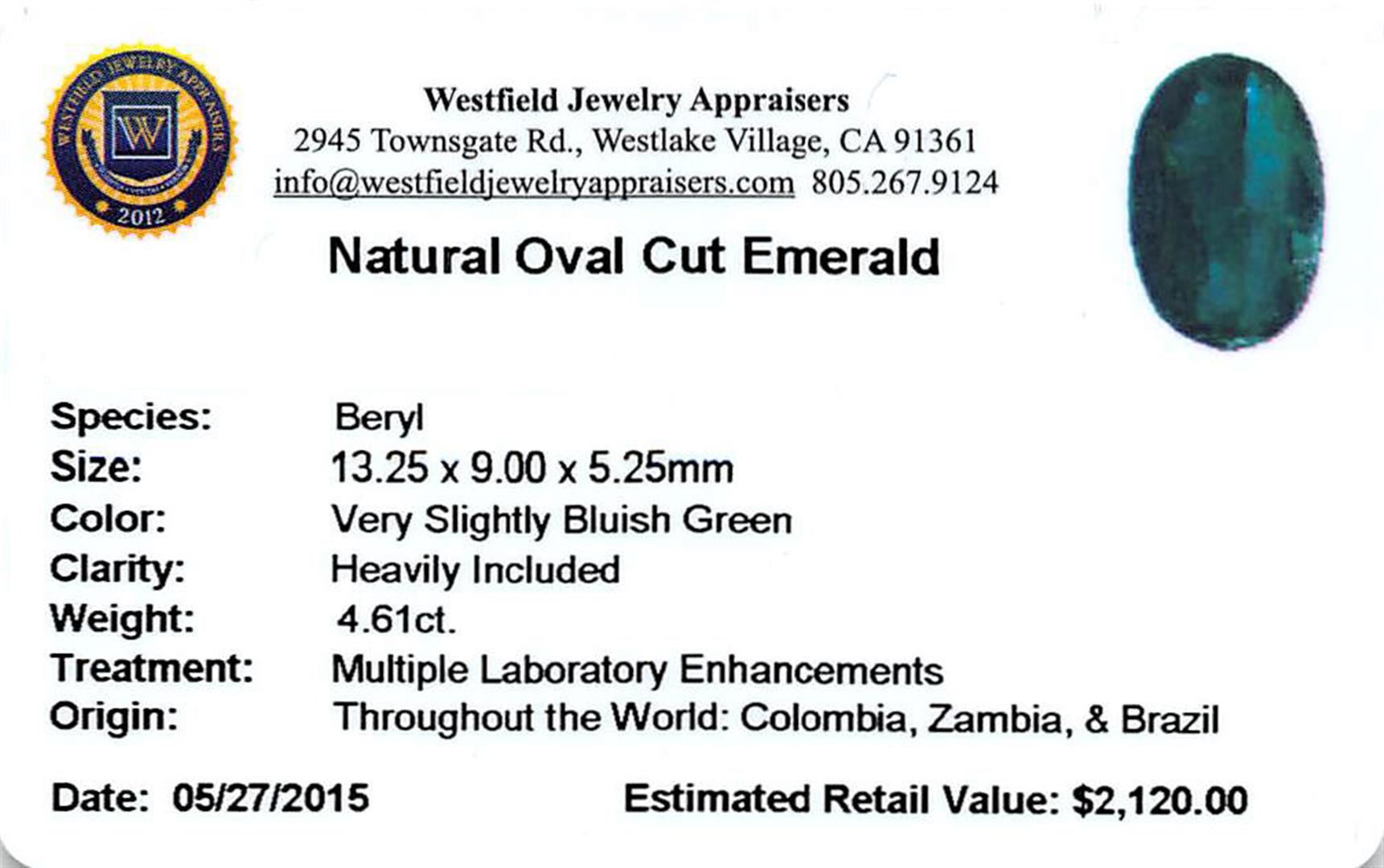 One oval mixed cut natural emerald, measuring 13.25 x 9.00 x 5.25mm, exact weight 4.61ct., clarity is heavily included, type III, dark, very slightly grayish, very slightly bluish green color, (GIA vslbG 7/3), cut is good. Transmitting light somewhat diffusely, translucent, Naturally occurring internal & external characteristics are present, Indications of multiple laboratory enhancements, including high temperature heat treatment. Westfield Appraised at $2,120.00.