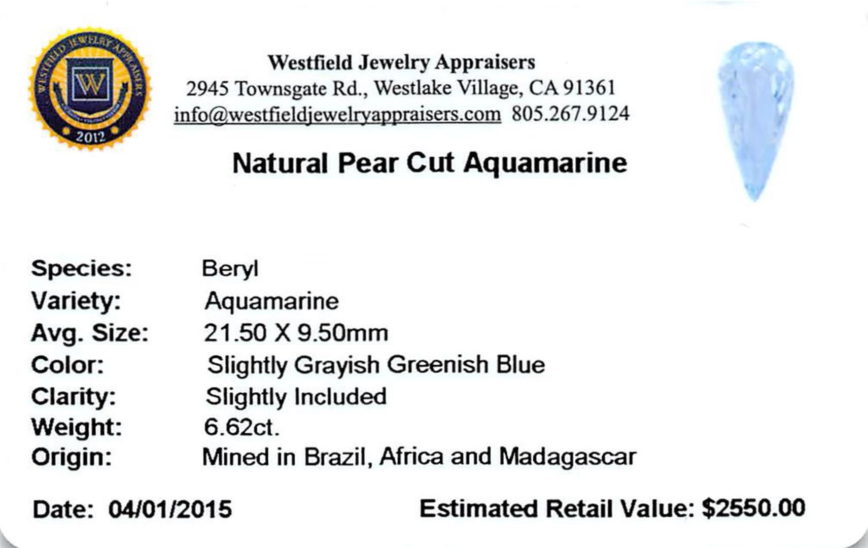 One pear cut natural aquamarine exact weight 4.61ct., clarity is slightly included, type I, medium, very slightly grayish, very slightly greenish blue color, (GIA vslgB 5/3), cut is good. Westfield Appraised at $1,775.00.