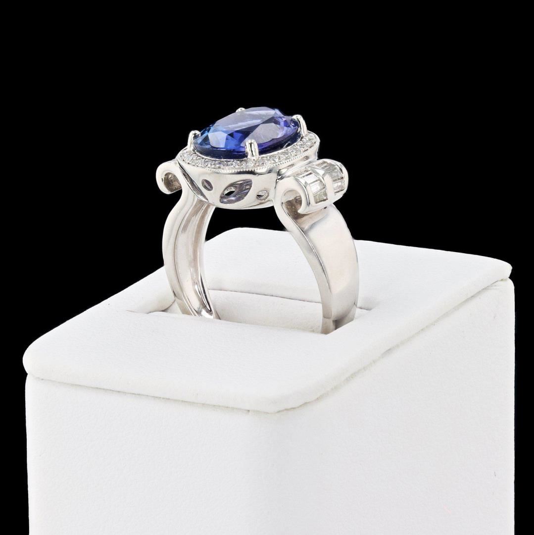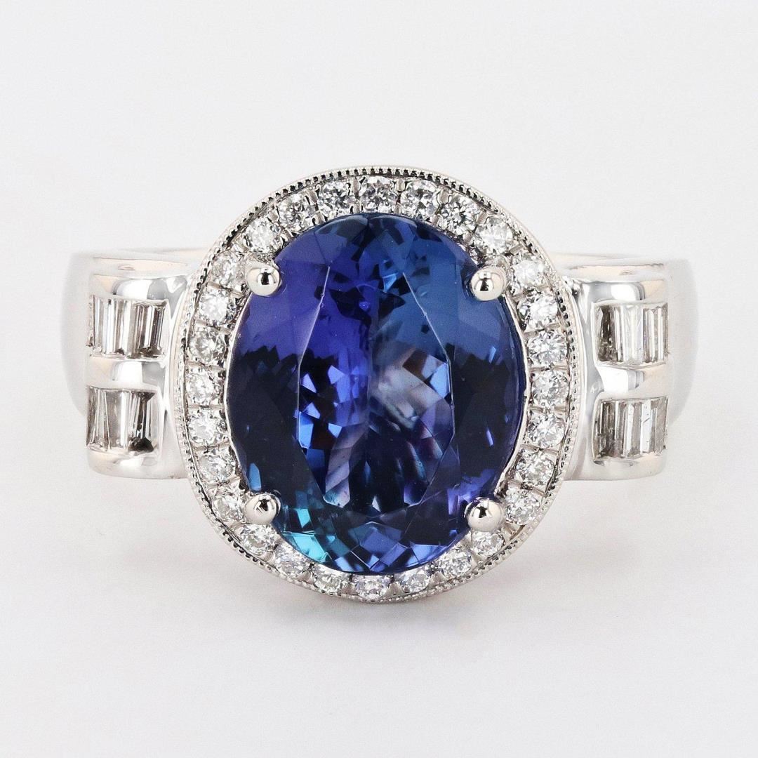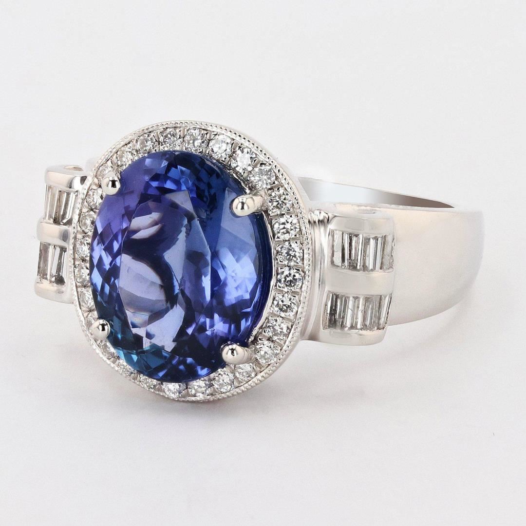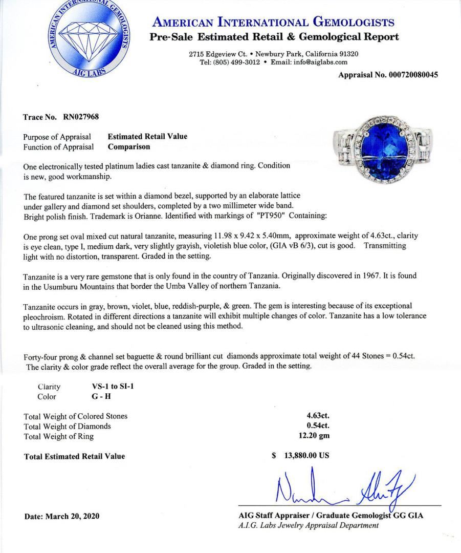 One electronically tested platinum ladies cast tanzanite & diamond ring. Condition is new, good workmanship. The featured tanzanite is set within a diamond bezel, supported by an elaborate lattice under gallery and diamond set shoulders, completed by a two millimeter wide band. Bright polish finish. Trademark is Orianne. Identified with markings of "PT950" Containing: One prong set oval mixed cut natural tanzanite, measuring 11.98 x 9.42 x 5.40mm, approximate weight of 4.63ct., clarity is eye clean, type I, medium dark, very slightly grayish, violetish blue color, (GIA vB 6/3), cut is good. Transmitting light with no distortion, transparent. Graded in the setting. Tanzanite is a very rare gemstone that is only found in the country of Tanzania. Originally discovered in 1967. It is found in the Usumburu Mountains that border the Umba Valley of northern Tanzania. Tanzanite occurs in gray, brown, violet, blue, reddish-purple, & green. The gem is interesting because of its exceptional pleochroism. Rotated in different directions a tanzanite will exhibit multiple changes of color. Tanzanite has a low tolerance to ultrasonic cleaning, and should not be cleaned using this method. Forty-four prong & channel set baguette & round brilliant cut diamonds approximate total weight of 44 Stones = 0.54ctw. The clarity & color grade reflect the overall average for the group. Graded in the setting. Clarity VS1 to SI1 Color G - H Total Weight of Colored Stones 4.63ct. Total Weight of Diamonds 0.54ctw. Total Weight of Ring 12.20 gm 4.63ct Tanzanite and 0.54ctw Diamond Platinum Ring Size: 7