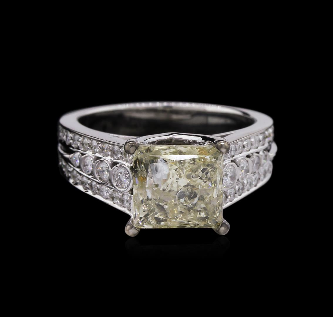 One electronically tested 14KT white gold lady's cast wedding ring with a cathedral shank with a bright polish finish. The featured lady's ring has a shank measuring 3.60 millimeters wide. Identified with markings of "14K". Condition is new, good workmanship. Containing: One prong set princess cut diamond, measuring 7.96 x 8.43 x 6.50mm (depth est.) , 10.00.%. GTCF approximate weight of 4.00ct. Graded in the setting. Clarity: I-2. Color: P - Q. Cut Good Forty-Two prong set round brilliant cut diamonds, measuring 1.40 - 1.35 x 0.87mm (depth est.) approximate total weight of 42 Stones = 0.42ct. Graded in the setting. Clarity: SI-1 to I-1. Color: H - I. Cut Good Six bezel set round brilliant cut diamonds, measuring 2.40 - 1.70 x 1.23mm (depth est.) approximate total weight of 6 Stones = 0.18ct. Graded in the setting. Clarity: SI-1 to I-1. Color: H - I. Cut Good Six prong set round brilliant cut diamonds, measuring 1.10 - 1.05 x 0.69mm (depth est.) approximate total weight of 6 Stones = 0.03ct. Graded in the setting. Clarity: SI-1 to SI-2. Color: H - I. Cut Good. Total Weight of Diamonds 4.63ct. Total Weight of Ring 7.40gm. GAS Appraised at $23,645.00.