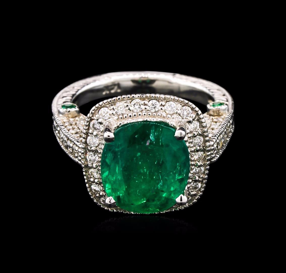 One 14K white gold ring 8.23g including: (1)-One center cushion cut Colombian emerald 4.48cts. (2)-24 pcs round cut tsavorite 0.30cts. (3)-6 pcs round emerald 0.15cts. All VS-SI clarity. RBGS Appraised at $66,000.00.