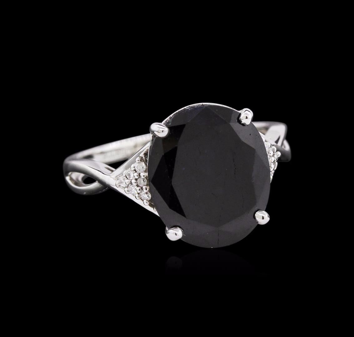 One 14KT white gold sapphire and diamond ring. An oval cut sapphire corundum gemstone is prong mounted in the center of the ring. Round brilliant cut diamonds accent the ring around the center gemstone and on both sides. The ring is cast stamped "14K" and has a gross weight of 3.7 Grams. Diamond(s): Shape: Round Brilliant Cut. Weight: 0.05 carat. Average Clarity: I1. Average Color: H-J. Symmetry: Very Good. Polish: Very Good. GemStone(s): Sapphire Corundum. Nature: Natural. Shape: Oval, Faceted. Quantity: 1, Mounted. Weight: 4.64 carat. Dimensions: Length - 12.55 mm. ; Width - 10.81 mm. Bulge: Visible. Clarity: SI, Type 3. Color: Blue (5/5). Symmetry: Very Good. Color Intensity: Medium. Transparency: Translucent. Tone: Dark. Enhancements: Indications of high temperature heat treatment, with glass and flux additives. Metal(s): Metal: Gold, Stamped. Purity: 14K. Color: White. Condition: Excellent. Finish: High polish. GGA Appraised at $3,370.00.