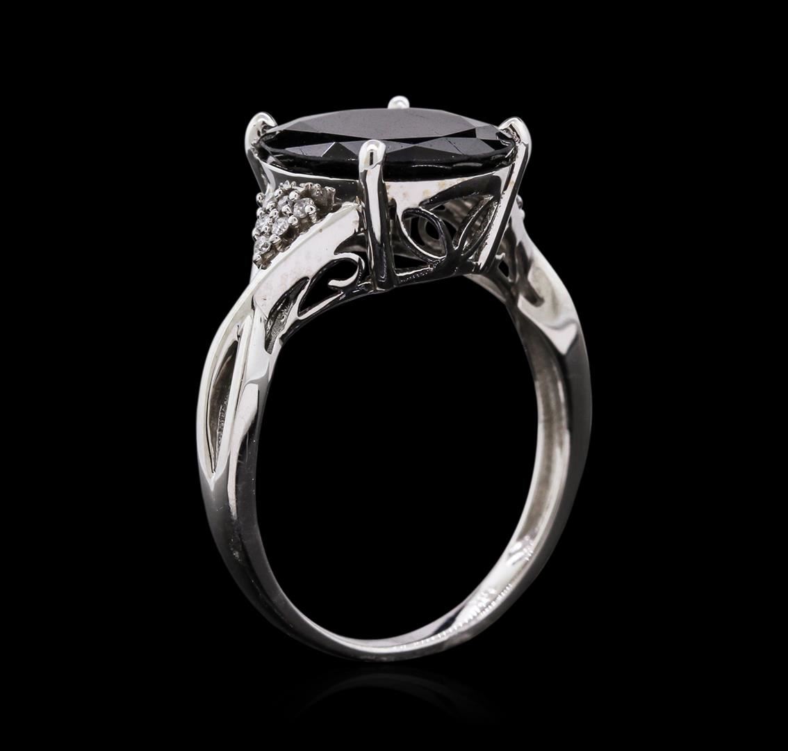 One 14KT white gold sapphire and diamond ring. An oval cut sapphire corundum gemstone is prong mounted in the center of the ring. Round brilliant cut diamonds accent the ring around the center gemstone and on both sides. The ring is cast stamped "14K" and has a gross weight of 3.7 Grams. Diamond(s): Shape: Round Brilliant Cut. Weight: 0.05 carat. Average Clarity: I1. Average Color: H-J. Symmetry: Very Good. Polish: Very Good. GemStone(s): Sapphire Corundum. Nature: Natural. Shape: Oval, Faceted. Quantity: 1, Mounted. Weight: 4.64 carat. Dimensions: Length - 12.55 mm. ; Width - 10.81 mm. Bulge: Visible. Clarity: SI, Type 3. Color: Blue (5/5). Symmetry: Very Good. Color Intensity: Medium. Transparency: Translucent. Tone: Dark. Enhancements: Indications of high temperature heat treatment, with glass and flux additives. Metal(s): Metal: Gold, Stamped. Purity: 14K. Color: White. Condition: Excellent. Finish: High polish. GGA Appraised at $3,370.00.