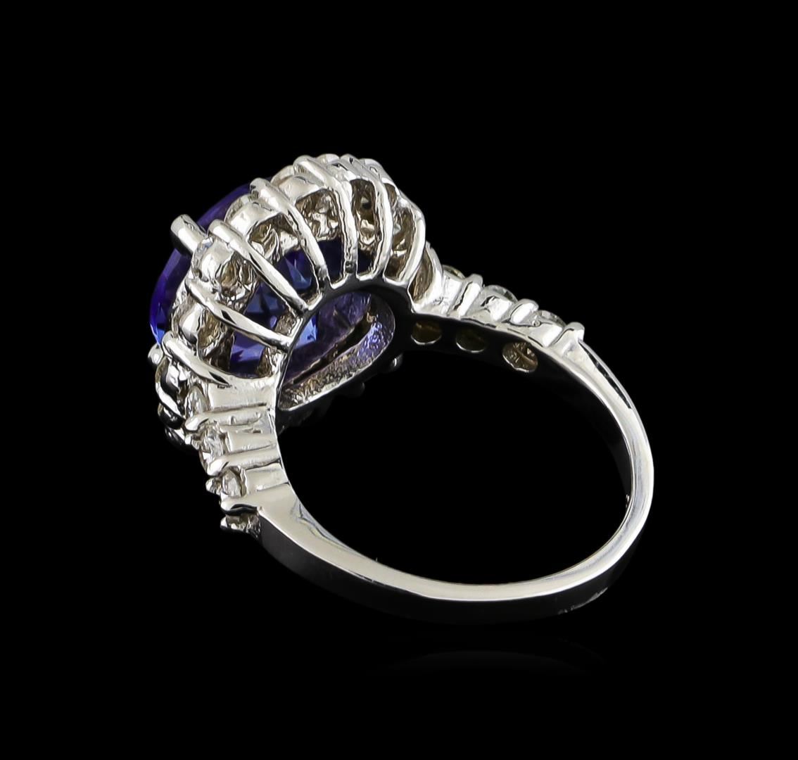 One electronically tested 14KT white gold ladies cast tanzanite and diamond ring with a bright polish finish. The featured tanzanite is set within a diamond bezel supported by a ribbed under gallery and diamond set shoulders, completed by a two millimeter wide band. Identified with markings of "14K". Condition is new, good workmanship. Containing: One prong set round mixed cut natural tanzanite, measuring 9.85 - 9.80 x 6.80 mm, 5%. bulge factor, approximate weight of 4.64ct., clarity is eye clean, type I, medium dark, very slightly grayish, bluish violet color, (GIA bV 6/3), cut is good. Transmitting light with no distortion, transparent. Graded in the setting. Tanzanite is a very rare gemstone that is only found in the country of Tanzania. Originally discovered in 1967. Tiffany & Company, named the stone Tanzanite. It is found in the Usumburu Mountains that border the Umba Valley of northern Tanzania. Tanzanite occurs in gray, brown, violet, blue, reddish-purple, & green. The gem is interesting because of its exceptional pleochroism. Rotated in different directions a tanzanite will exhibit multiple changes of color. Tanzanite has a low tolerance to ultrasonic cleaning, and should not be cleaned using this method. Twenty-Two prong set round brilliant cut diamonds, measuring 2.35 - 2.15 x 1.35mm (depth est.) approximate. Total Weight of 22 Stones = 0.95ct. Graded in the setting. Clarity: SI-2 to I-2. Color: F - G. Total Weight of Colored Stones 4.64ct. Total Weight of Diamonds 0.95ct. Total Weight of Ring 6.07gm. AIG Appraised at $13,455.00.