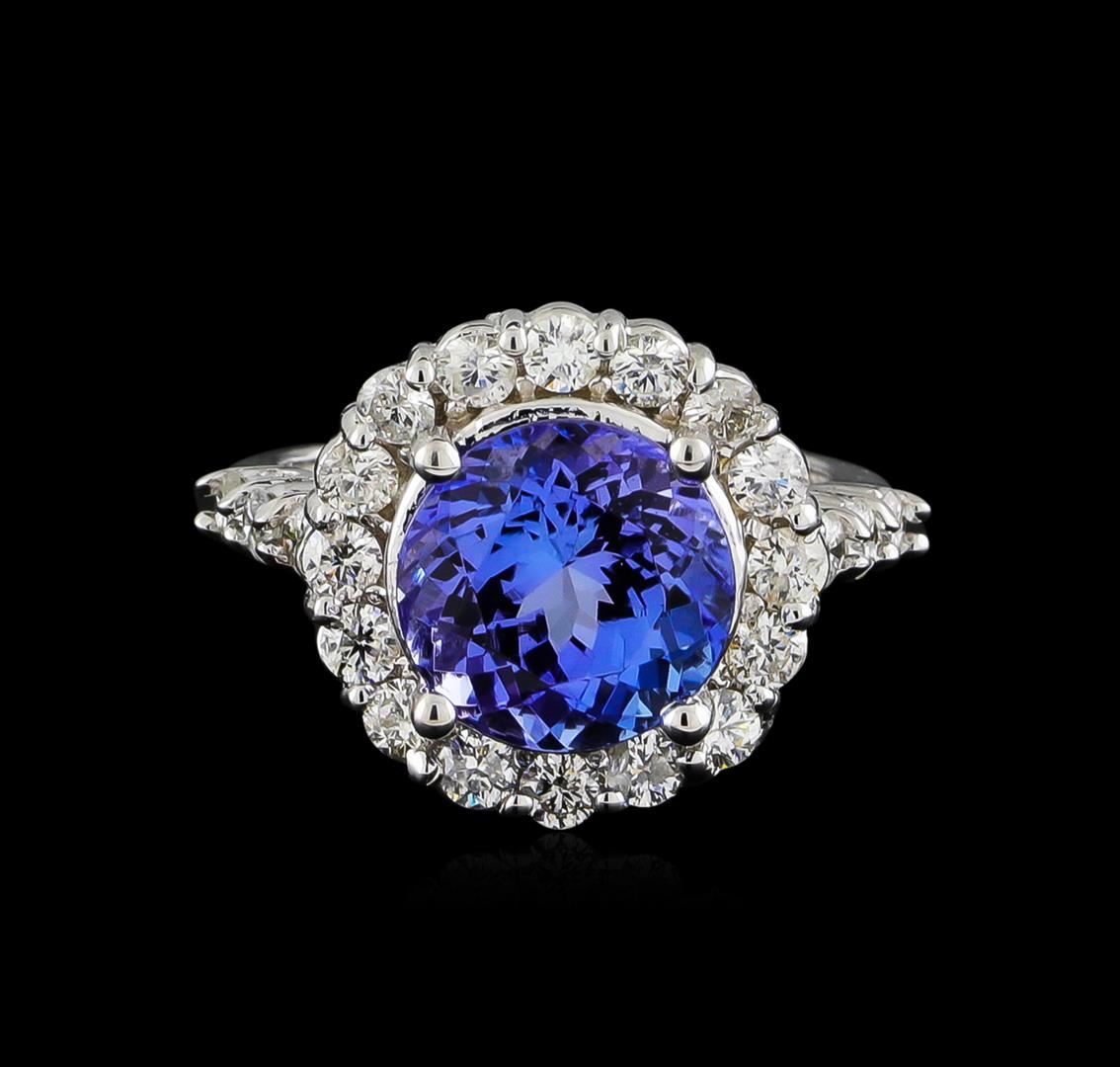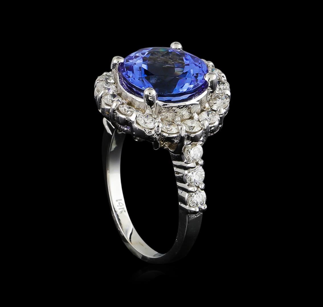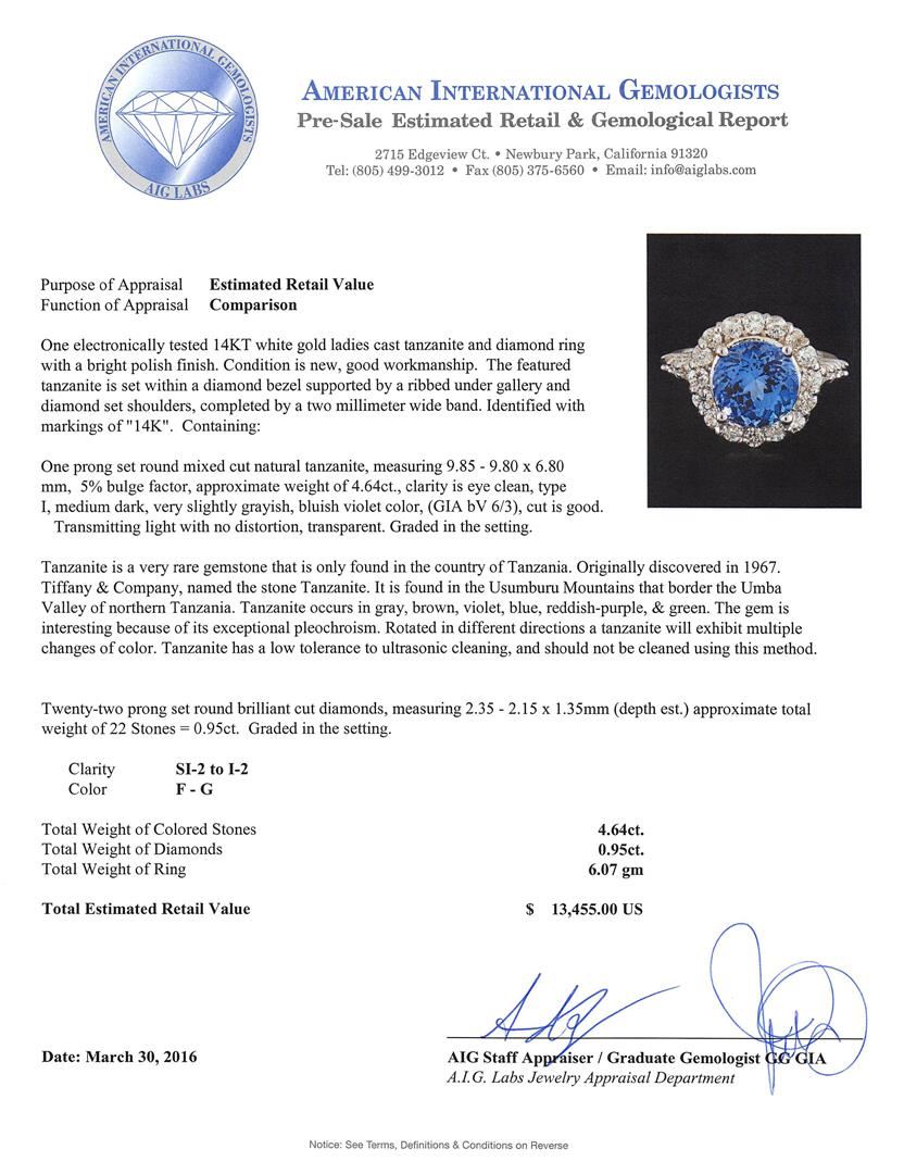 One electronically tested 14KT white gold ladies cast tanzanite and diamond ring with a bright polish finish. The featured tanzanite is set within a diamond bezel supported by a ribbed under gallery and diamond set shoulders, completed by a two millimeter wide band. Identified with markings of "14K". Condition is new, good workmanship. Containing: One prong set round mixed cut natural tanzanite, measuring 9.85 - 9.80 x 6.80 mm, 5%. bulge factor, approximate weight of 4.64ct., clarity is eye clean, type I, medium dark, very slightly grayish, bluish violet color, (GIA bV 6/3), cut is good. Transmitting light with no distortion, transparent. Graded in the setting. Tanzanite is a very rare gemstone that is only found in the country of Tanzania. Originally discovered in 1967. Tiffany & Company, named the stone Tanzanite. It is found in the Usumburu Mountains that border the Umba Valley of northern Tanzania. Tanzanite occurs in gray, brown, violet, blue, reddish-purple, & green. The gem is interesting because of its exceptional pleochroism. Rotated in different directions a tanzanite will exhibit multiple changes of color. Tanzanite has a low tolerance to ultrasonic cleaning, and should not be cleaned using this method. Twenty-Two prong set round brilliant cut diamonds, measuring 2.35 - 2.15 x 1.35mm (depth est.) approximate. Total Weight of 22 Stones = 0.95ct. Graded in the setting. Clarity: SI-2 to I-2. Color: F - G. Total Weight of Colored Stones 4.64ct. Total Weight of Diamonds 0.95ct. Total Weight of Ring 6.07gm. AIG Appraised at $13,455.00.