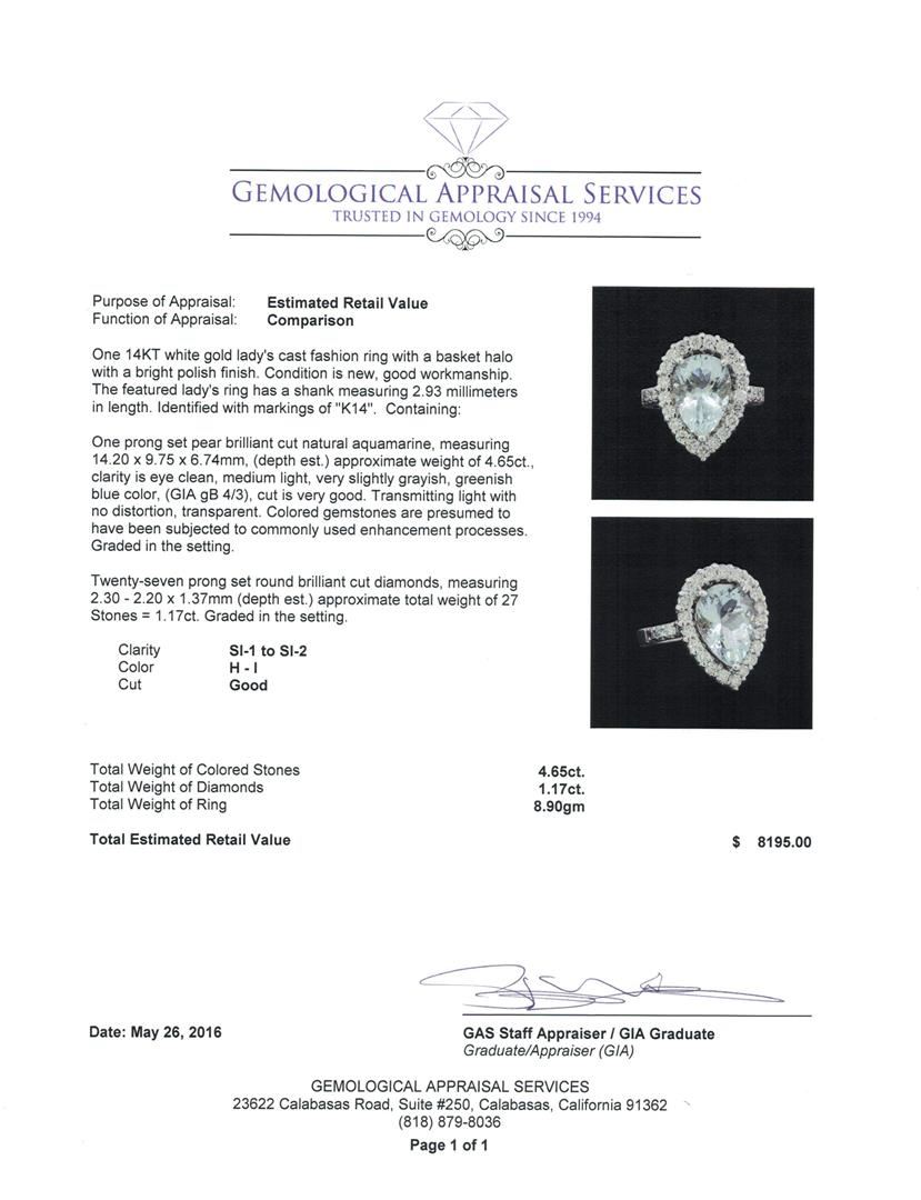 One 14KT white gold lady's cast fashion ring with a basket halo with a bright polish finish. The featured lady's ring has a shank measuring 2.93 millimeters in width. Identified with markings of "K14". Condition is new, good workmanship. Containing: One prong set pear brilliant cut natural aquamarine, measuring 14.20 x 9.75 x 6.74mm, (depth est.) approximate weight of 4.65ct., clarity is eye clean, medium light, very slightly grayish, greenish blue color, (GIA gB 4/3), cut is very good. Transmitting light with no distortion, transparent. Colored gemstones are presumed to have been subjected to commonly used enhancement processes. Graded in the setting. Twenty-Seven prong set round brilliant cut diamonds, measuring 2.30 - 2.20 x 1.37mm (depth est.) approximate total weight of 27 Stones = 1.17ct. Graded in the setting. Clarity: SI-1 to SI-2. Color: H - I. Cut Good. Total Weight of Colored Stones 4.65ct. Total Weight of Diamonds 1.17ct. Total Weight of Ring 8.90gm. GAS Appraised at $8,195.00.