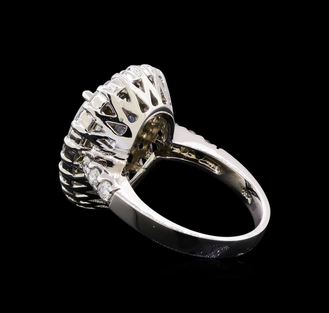 One 14KT white gold lady's cast fashion ring with a basket halo with a bright polish finish. The featured lady's ring has a shank measuring 2.93 millimeters in width. Identified with markings of "K14". Condition is new, good workmanship. Containing: One prong set pear brilliant cut natural aquamarine, measuring 14.20 x 9.75 x 6.74mm, (depth est.) approximate weight of 4.65ct., clarity is eye clean, medium light, very slightly grayish, greenish blue color, (GIA gB 4/3), cut is very good. Transmitting light with no distortion, transparent. Colored gemstones are presumed to have been subjected to commonly used enhancement processes. Graded in the setting. Twenty-Seven prong set round brilliant cut diamonds, measuring 2.30 - 2.20 x 1.37mm (depth est.) approximate total weight of 27 Stones = 1.17ct. Graded in the setting. Clarity: SI-1 to SI-2. Color: H - I. Cut Good. Total Weight of Colored Stones 4.65ct. Total Weight of Diamonds 1.17ct. Total Weight of Ring 8.90gm. GAS Appraised at $8,195.00.