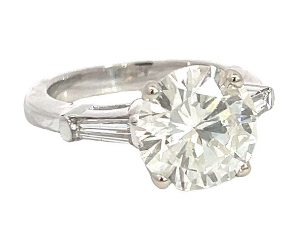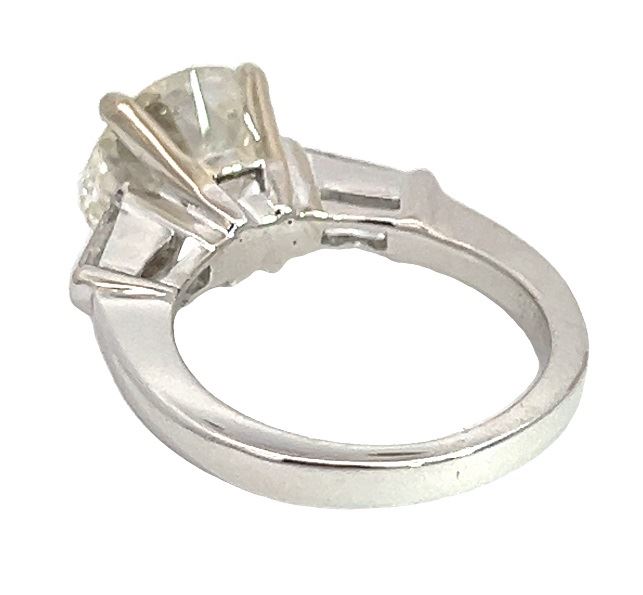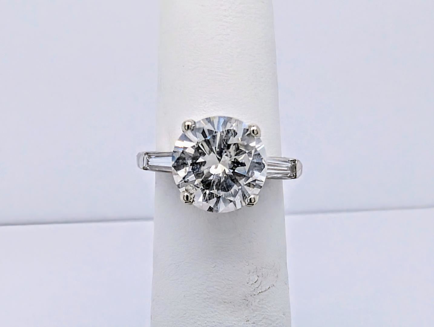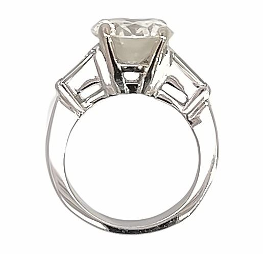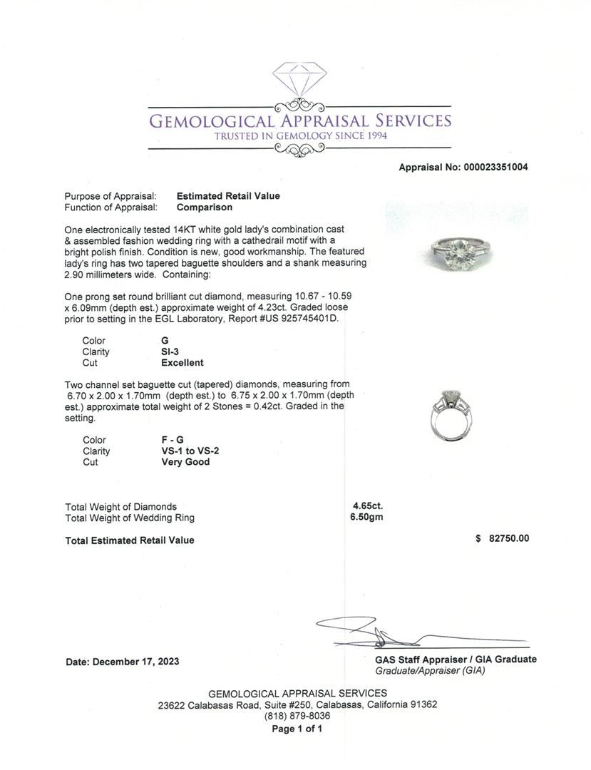 One electronically tested 14KT white gold lady's combination cast & assembled fashion wedding ring with a cathedral motif with a bright polish finish. The featured lady's ring has two tapered baguette shoulders and a shank measuring 2.90 millimeters wide. Condition is new, good workmanship. Containing: One prong set round brilliant cut diamond, measuring 10.67 - 10.59 x 6.09mm (depth est.) approximate weight of 4.23ct. Graded loose prior to setting in the EGL Laboratory, Report #US 925745401D. Color G Clarity SI-3 Cut Excellent Two channel set baguette cut (tapered) diamonds, measuring from 6.70 x 2.00 x 1.70mm (depth est.) to 6.75 x 2.00 x 1.70mm (depth est.) approximate total weight of 2 Stones = 0.42ct. Graded in the setting. Color F - G Clarity VS-1 to VS-2 Cut Very Good Total Weight of Diamonds 4.65ct. Total Weight of Wedding Ring 6.50gm Estimated Retail Value $ 82750.00