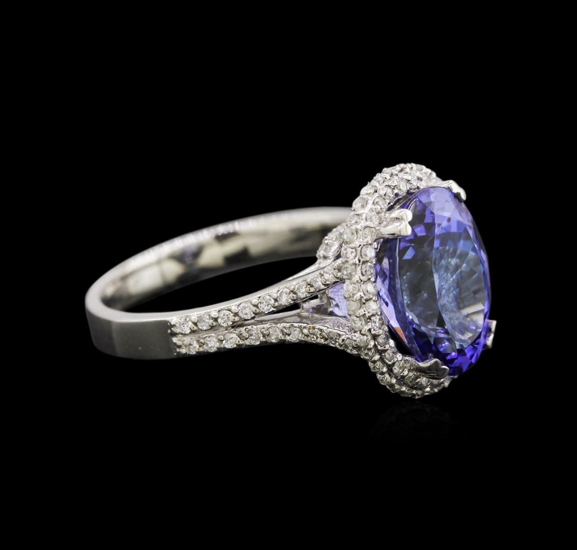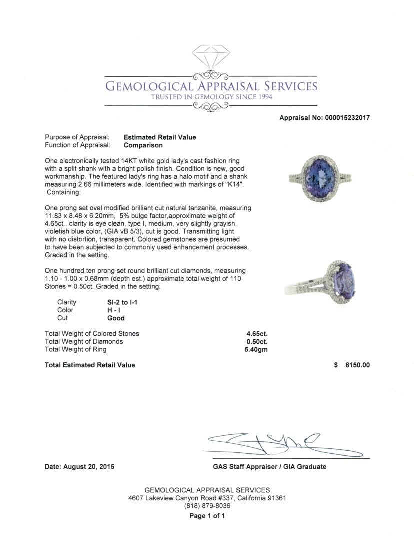 One electronically tested 14KT white gold lady's cast fashion ring with a split shank with a bright polish finish. The featured lady's ring has a halo motif and a shank measuring 2.66 millimeters wide. Identified with markings of "K14". Condition is new, good workmanship. Containing: One prong set oval modified brilliant cut natural tanzanite, measuring 11.83 x 8.48 x 6.20mm, 5% bulge factor, approximate weight of 4.65ct., clarity is eye clean, type I, medium, very slightly grayish, violetish blue color, (GIA vB 5/3), cut is good. Transmitting light with no distortion, transparent. Colored gemstones are presumed to have been subjected to commonly used enhancement processes. Graded in the setting. One Hundred Ten prong set round brilliant cut diamonds, measuring 1.10 - 1.00 x 0.68mm (depth est.) approximate total weight of 110 Stones = 0.50ct. Graded in the setting. Clarity: SI-2 to I-1. Color: H - I. Cut Good. Total Weight of Colored Stones 4.65ct. Total Weight of Diamonds 0.50ct. Total Weight of Ring 5.40gm. GAS Appraised at $8,150.00.