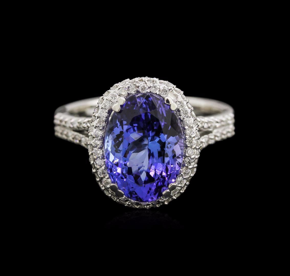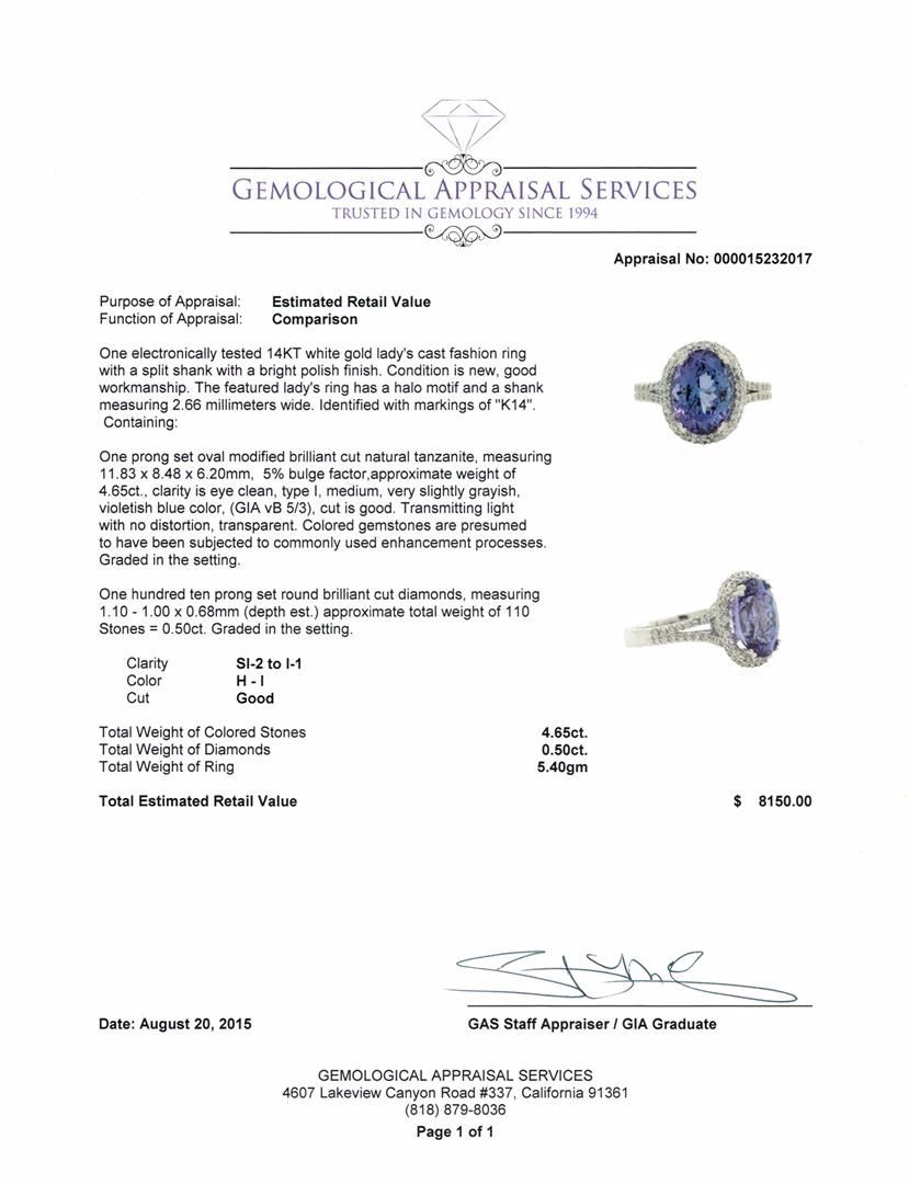 One electronically tested 14KT white gold lady's cast fashion ring with a split shank with a bright polish finish. The featured lady's ring has a halo motif and a shank measuring 2.66 millimeters wide. Identified with markings of "K14". Condition is new, good workmanship. Containing: One prong set oval modified brilliant cut natural tanzanite, measuring 11.83 x 8.48 x 6.20mm, 5% bulge factor, approximate weight of 4.65ct., clarity is eye clean, type I, medium, very slightly grayish, violetish blue color, (GIA vB 5/3), cut is good. Transmitting light with no distortion, transparent. Colored gemstones are presumed to have been subjected to commonly used enhancement processes. Graded in the setting. One Hundred Ten prong set round brilliant cut diamonds, measuring 1.10 - 1.00 x 0.68mm (depth est.) approximate total weight of 110 Stones = 0.50ct. Graded in the setting. Clarity: SI-2 to I-1. Color: H - I. Cut Good. Total Weight of Colored Stones 4.65ct. Total Weight of Diamonds 0.50ct. Total Weight of Ring 5.40gm. GAS Appraised at $8,150.00.