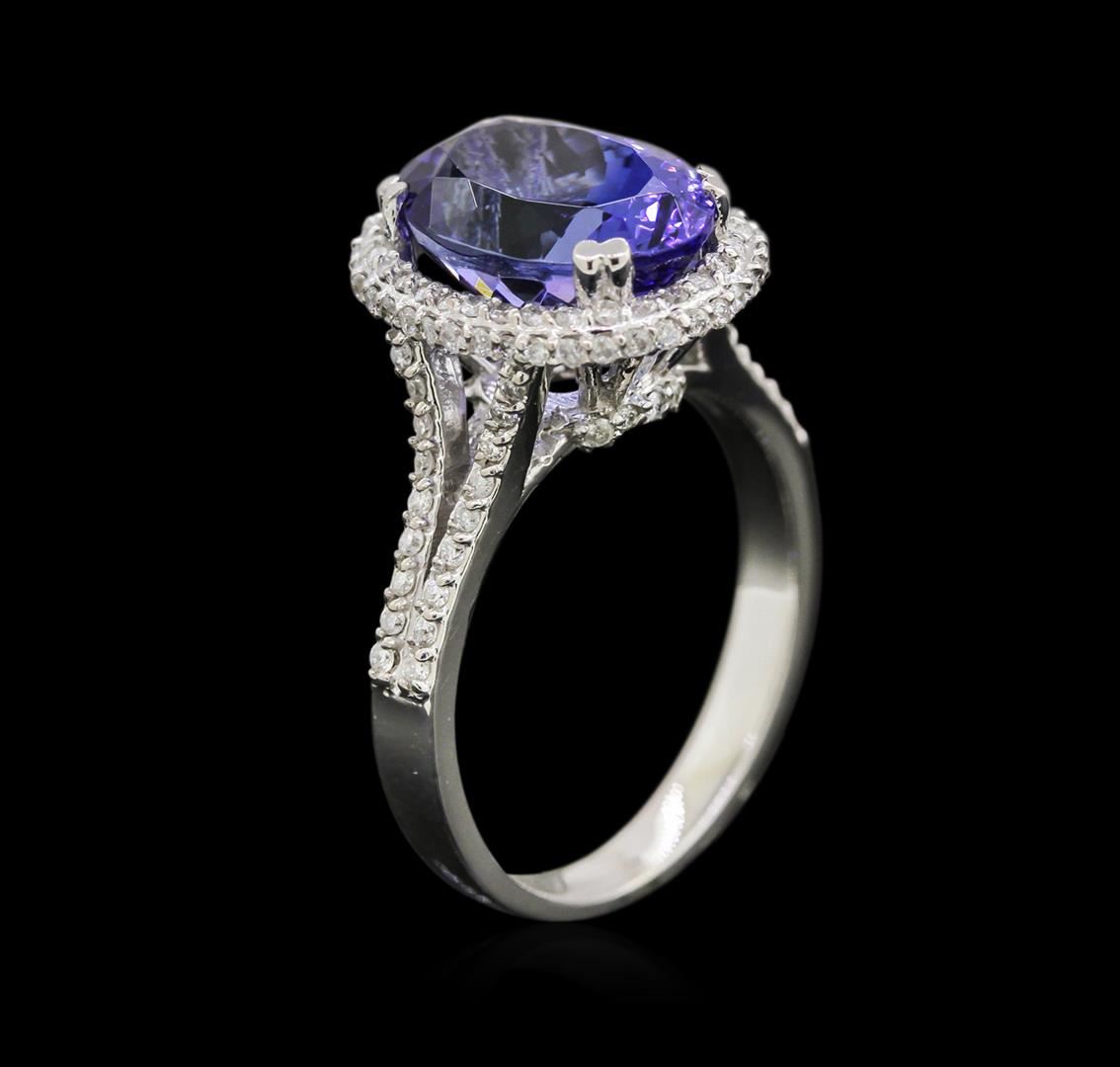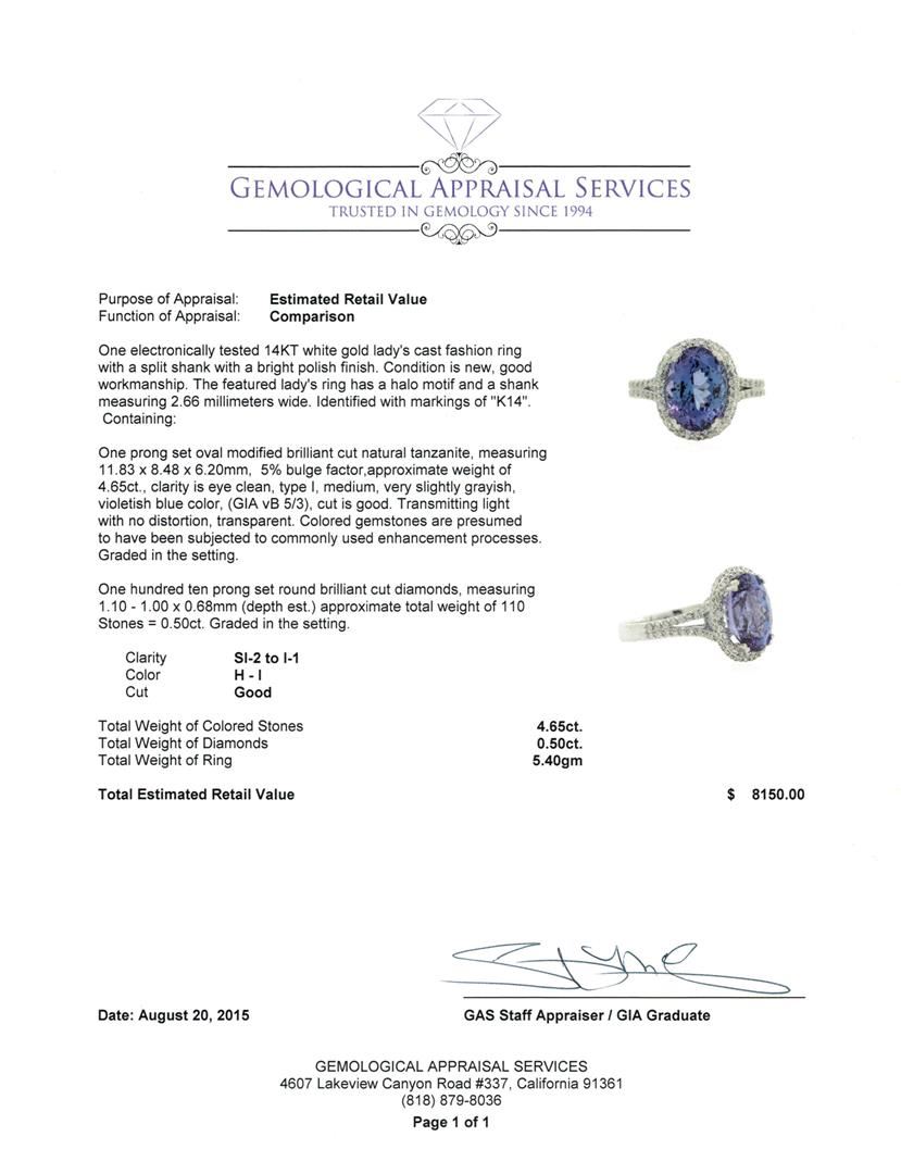 One electronically tested 14KT white gold lady's cast fashion ring with a split shank with a bright polish finish. The featured lady's ring has a halo motif and a shank measuring 2.66 millimeters wide. Identified with markings of "K14". Condition is new, good workmanship. Containing: One prong set oval modified brilliant cut natural tanzanite, measuring 11.83 x 8.48 x 6.20mm, 5% bulge factor, approximate weight of 4.65ct., clarity is eye clean, type I, medium, very slightly grayish, violetish blue color, (GIA vB 5/3), cut is good. Transmitting light with no distortion, transparent. Colored gemstones are presumed to have been subjected to commonly used enhancement processes. Graded in the setting. One Hundred Ten prong set round brilliant cut diamonds, measuring 1.10 - 1.00 x 0.68mm (depth est.) approximate total weight of 110 Stones = 0.50ct. Graded in the setting. Clarity: SI-2 to I-1. Color: H - I. Cut Good. Total Weight of Colored Stones 4.65ct. Total Weight of Diamonds 0.50ct. Total Weight of Ring 5.40gm. GAS Appraised at $8,150.00.