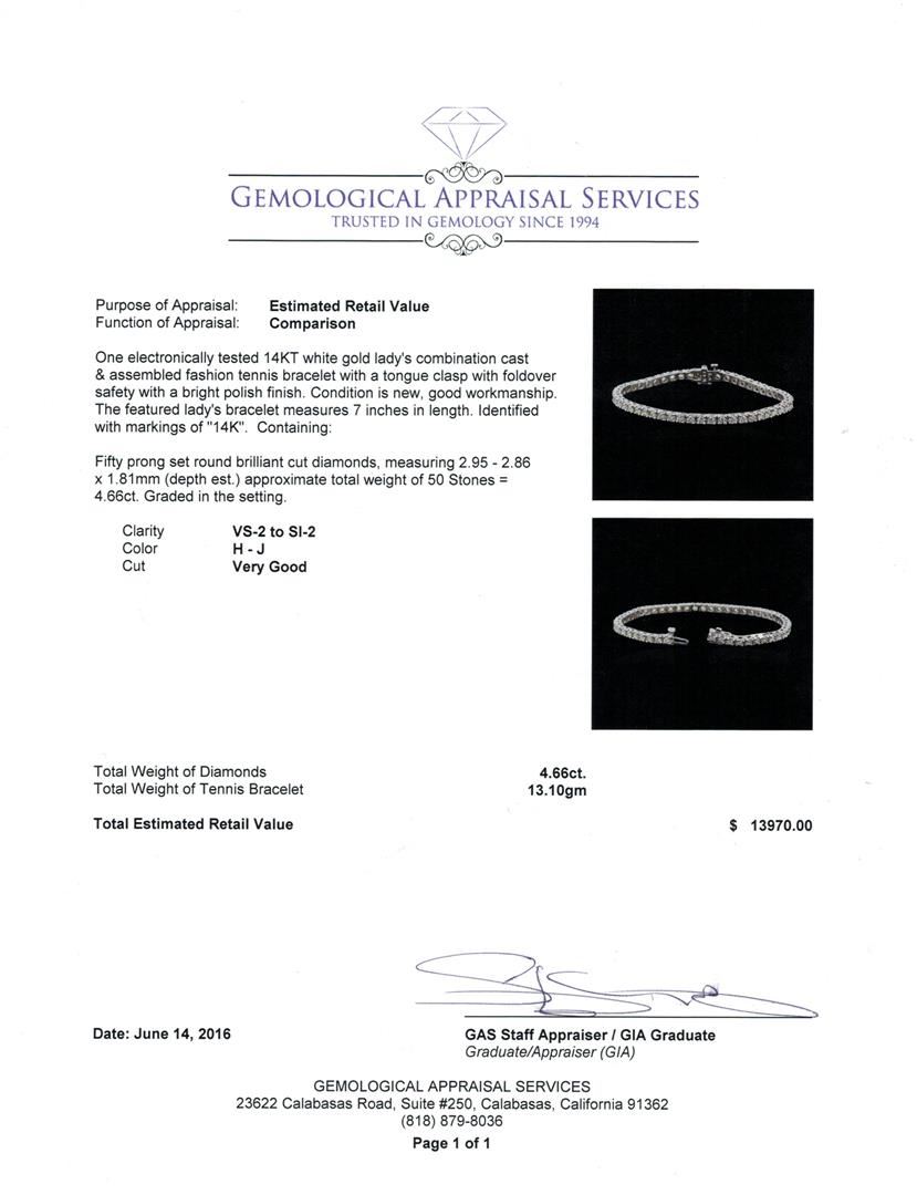 One electronically tested 14KT white gold lady's combination cast & assembled fashion tennis bracelet with a tongue clasp with foldover safety with a bright polish finish. The featured lady's bracelet measures 7 inches in length. Identified with markings of "14K". Condition is new, good workmanship. Containing: Fifty prong set round brilliant cut diamonds, measuring 2.95 - 2.86 x 1.81mm (depth est.) approximate total weight of 50 Stones = 4.66ct. Graded in the setting. Clarity: VS-2 to SI-2. Color: H - Very Good. Total Weight of Diamonds 4.66ct. Total Weight of Tennis Bracelet 13.10gm. GAS Appraised at $13,970.00.