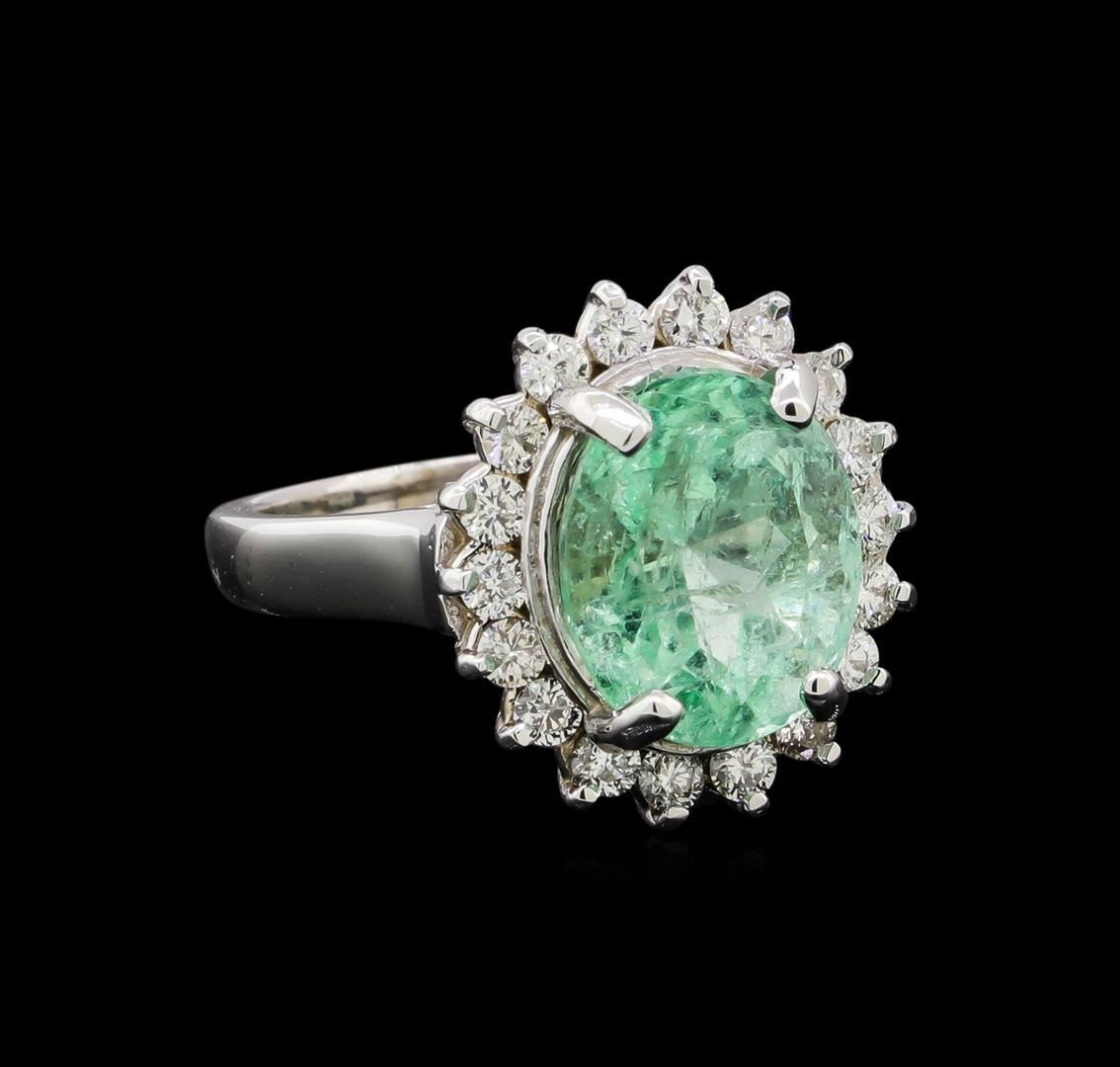One electronically tested 14KT white gold lady's cast fashion ring with a basket halo with a bright polish finish. The featured lady's ring has a shank measuring 2.45 millimeters in width. Identified with markings of '14K'. Condition is new, good workmanship. Containing: One prong set oval modified brilliant cut natural emerald, measuring 11.10 x 9.15 x 8.08mm, (depth est.) approximate weight of 4.66ct., clarity is heavily included, medium light, moderately strong, green color, (GIA G 4/4), cut is good. Transmitting light somewhat diffusely, transparent to translucent. Indications of oil residue. Naturally occurring internal & external characteristics are present. Colored gemstones are presumed to have been subjected to commonly used enhancement processes. Graded in the setting. Eighteen prong set round brilliant cut diamonds, measuring 2.10 - 2.00 x 1.27mm (depth est.) approximate total weight of 18 Stones = 0.60ct. Graded in the setting. Clarity SI-1 to SI-2. Color: H - I Cut Good. Total Weight of Colored Stones 4.66ct.. Total Weight of Diamonds 0.60ct.. Total Weight of Ring 6.20gm. GAS Appraised at $5,830.00.