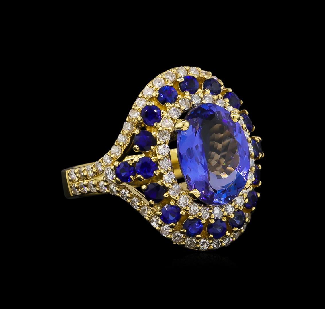 One electronically tested 14KT yellow gold lady's cast fashion ring with a basket halo with a bright polish finish. The featured lady's ring has a shank measuring 3.76 millimeters wide. Identified with markings of "K14". Condition is new, good workmanship. Containing: One prong set oval modified brilliant cut natural tanzanite, measuring 11.05 x 8.45 x 4.87mm, 11%. bulge factor, approximate weight of 3.54ct., clarity is eye clean, type I, medium, moderately strong, bluish violet color, (GIA bV 5/4), cut is excellent. Transmitting light with no distortion, transparent. Colored gemstones are presumed to have been subjected to commonly used enhancement processes. Graded in the setting. Eighteen prong set round modified brilliant cut natural blue sapphires, measuring 2.30 - 2.25 x 1.48 mm, approximate. Total Weight of 1.12ct., clarity is eye clean, type II, medium dark, strong, blue color, (GIA B 6/5), cut is very good. Transmitting light with no distortion, transparent. Graded in the setting. Two prong set round brilliant cut diamonds, measuring 1.80 - 1.70 x 1.09mm (depth est.) approximate. Total Weight of 2 Stones = 0.04ct. Graded in the setting. Clarity: VS-2 to SI-1. Color: Good Seventy-Eight prong set round brilliant cut diamonds, measuring 1.40 - 1.35 x 0.86mm (depth est.) approximate. Total Weight of 78 Stones = 0.78ct. Graded in the setting. Clarity: SI-1 to I-1. Color: H - I. Cut Good. Total Weight of Colored Stones 4.66ct. Total Weight of Diamonds 0.82ct. Total Weight of Ring 8.10gm. GAS Appraised at $10,795.00.