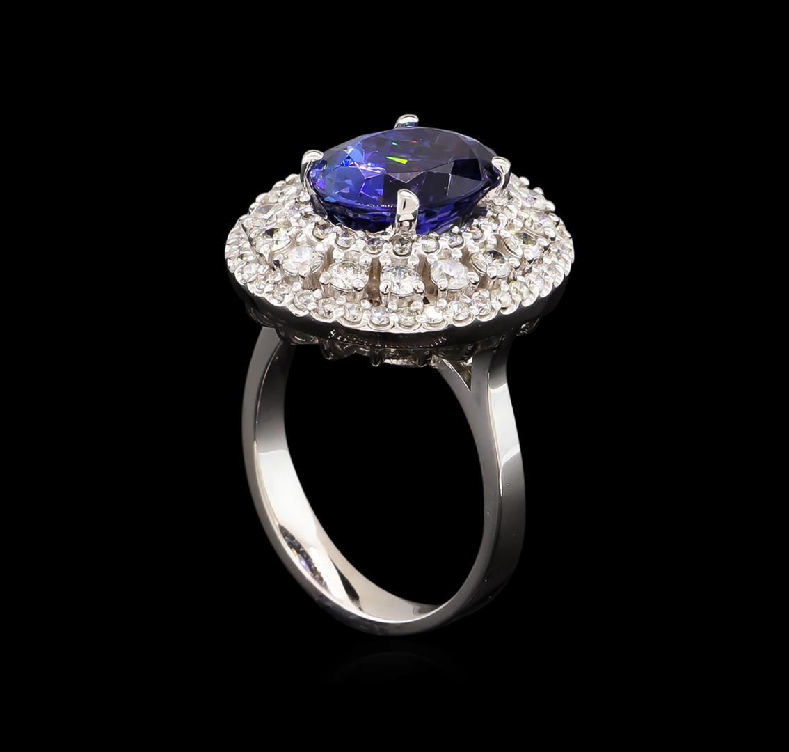 One electronically tested 14KT white gold lady's cast fashion ring with a triple basket halo with a bright polish finish. The featured lady's ring has a shank measuring 3.27 millimeters wide. Identified with markings of "K14". Condition is new, good workmanship. Containing: One prong set oval modified brilliant cut natural tanzanite, measuring 11.62 x 8.90 x 6.73mm, approximate weight of 4.66ct., clarity is eye clean, type I, medium dark, very slightly grayish, violetish blue color, (GIA vB 6/3), cut is very good. Transmitting light with no distortion, transparent. Colored gemstones are presumed to have been subjected to commonly used enhancement processes. Graded in the setting. Sixteen prong set round brilliant cut diamonds, measuring 2.30 - 2.20 x 1.35mm (depth est.) approximate total weight of 16 Stones = 0.65ct. Graded in the setting. Clarity: VS-2 to SI-2. Color: G - Very Good Sixty-Four prong set round brilliant cut diamonds, measuring 1.40 - 1.30 x 0.81mm (depth est.) approximate total weight of 64 Stones = 0.55ct. Graded in the setting. Clarity: SI-1 to I-1. Color: G - Good. Total Weight of Colored Stones 4.66ct. Total Weight of Diamonds 1.20ct. Total Weight of Ring 8.50gm. GAS Appraised at $12,540.00.