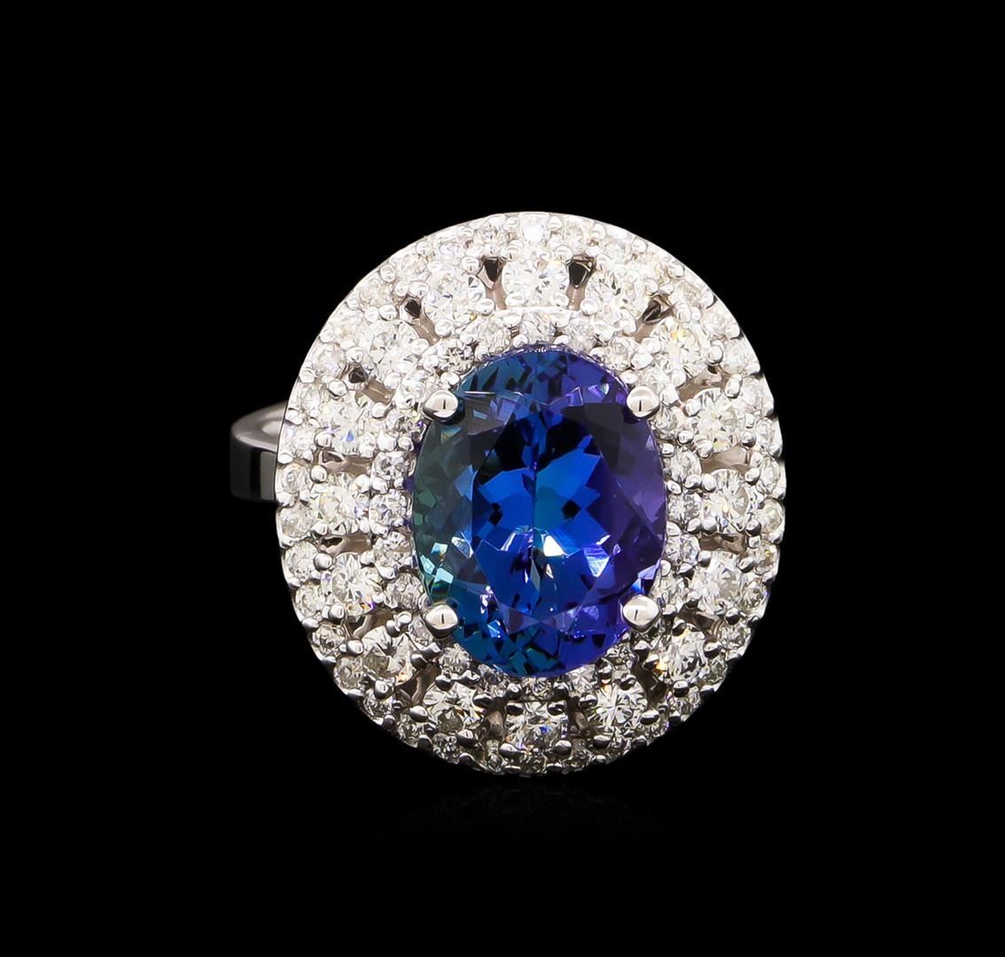 One electronically tested 14KT white gold lady's cast fashion ring with a triple basket halo with a bright polish finish. The featured lady's ring has a shank measuring 3.27 millimeters wide. Identified with markings of "K14". Condition is new, good workmanship. Containing: One prong set oval modified brilliant cut natural tanzanite, measuring 11.62 x 8.90 x 6.73mm, approximate weight of 4.66ct., clarity is eye clean, type I, medium dark, very slightly grayish, violetish blue color, (GIA vB 6/3), cut is very good. Transmitting light with no distortion, transparent. Colored gemstones are presumed to have been subjected to commonly used enhancement processes. Graded in the setting. Sixteen prong set round brilliant cut diamonds, measuring 2.30 - 2.20 x 1.35mm (depth est.) approximate total weight of 16 Stones = 0.65ct. Graded in the setting. Clarity: VS-2 to SI-2. Color: G - Very Good Sixty-Four prong set round brilliant cut diamonds, measuring 1.40 - 1.30 x 0.81mm (depth est.) approximate total weight of 64 Stones = 0.55ct. Graded in the setting. Clarity: SI-1 to I-1. Color: G - Good. Total Weight of Colored Stones 4.66ct. Total Weight of Diamonds 1.20ct. Total Weight of Ring 8.50gm. GAS Appraised at $12,540.00.