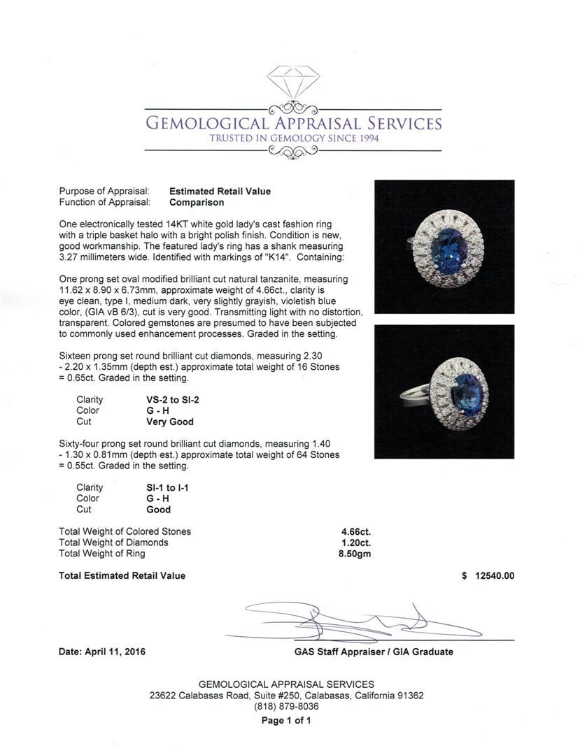 One electronically tested 14KT white gold lady's cast fashion ring with a triple basket halo with a bright polish finish. The featured lady's ring has a shank measuring 3.27 millimeters wide. Identified with markings of "K14". Condition is new, good workmanship. Containing: One prong set oval modified brilliant cut natural tanzanite, measuring 11.62 x 8.90 x 6.73mm, approximate weight of 4.66ct., clarity is eye clean, type I, medium dark, very slightly grayish, violetish blue color, (GIA vB 6/3), cut is very good. Transmitting light with no distortion, transparent. Colored gemstones are presumed to have been subjected to commonly used enhancement processes. Graded in the setting. Sixteen prong set round brilliant cut diamonds, measuring 2.30 - 2.20 x 1.35mm (depth est.) approximate total weight of 16 Stones = 0.65ct. Graded in the setting. Clarity: VS-2 to SI-2. Color: G - Very Good Sixty-Four prong set round brilliant cut diamonds, measuring 1.40 - 1.30 x 0.81mm (depth est.) approximate total weight of 64 Stones = 0.55ct. Graded in the setting. Clarity: SI-1 to I-1. Color: G - Good. Total Weight of Colored Stones 4.66ct. Total Weight of Diamonds 1.20ct. Total Weight of Ring 8.50gm. GAS Appraised at $12,540.00.