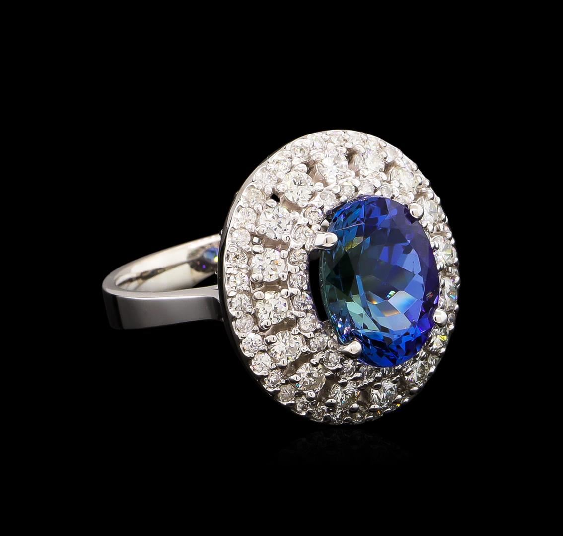 One electronically tested 14KT white gold lady's cast fashion ring with a triple basket halo with a bright polish finish. The featured lady's ring has a shank measuring 3.27 millimeters wide. Identified with markings of "K14". Condition is new, good workmanship. Containing: One prong set oval modified brilliant cut natural tanzanite, measuring 11.62 x 8.90 x 6.73mm, approximate weight of 4.66ct., clarity is eye clean, type I, medium dark, very slightly grayish, violetish blue color, (GIA vB 6/3), cut is very good. Transmitting light with no distortion, transparent. Colored gemstones are presumed to have been subjected to commonly used enhancement processes. Graded in the setting. Sixteen prong set round brilliant cut diamonds, measuring 2.30 - 2.20 x 1.35mm (depth est.) approximate total weight of 16 Stones = 0.65ct. Graded in the setting. Clarity: VS-2 to SI-2. Color: G - Very Good Sixty-Four prong set round brilliant cut diamonds, measuring 1.40 - 1.30 x 0.81mm (depth est.) approximate total weight of 64 Stones = 0.55ct. Graded in the setting. Clarity: SI-1 to I-1. Color: G - Good. Total Weight of Colored Stones 4.66ct. Total Weight of Diamonds 1.20ct. Total Weight of Ring 8.50gm. GAS Appraised at $12,540.00.