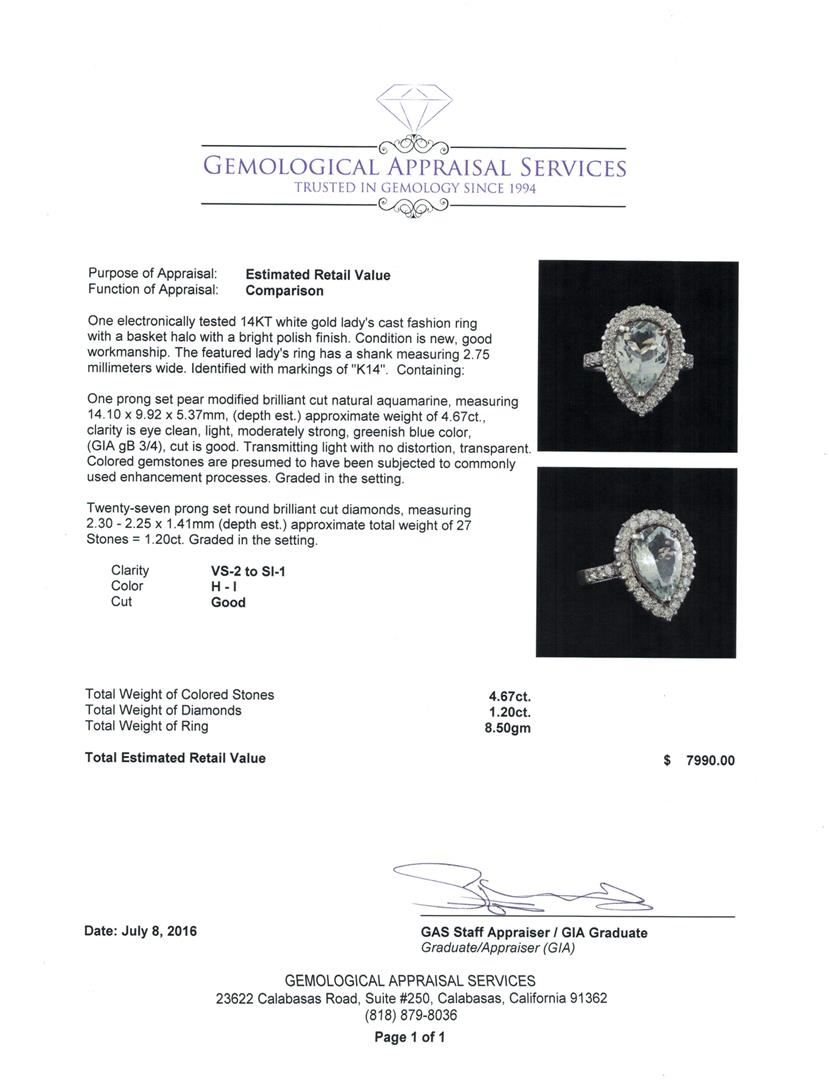 One electronically tested 14KT white gold lady's cast fashion ring with a basket halo with a bright polish finish. The featured lady's ring has a shank measuring 2.75 millimeters wide. Identified with markings of "K14". Condition is new, good workmanship. Containing: One prong set pear modified brilliant cut natural aquamarine, measuring 14.10 x 9.92 x 5.37mm, (depth est.) approximate weight of 4.67ct., clarity is eye clean, light, moderately strong, greenish blue color, (GIA gB 3/4), cut is good. Transmitting light with no distortion, transparent. Colored gemstones are presumed to have been subjected to commonly used enhancement processes. Graded in the setting. Twenty-Seven prong set round brilliant cut diamonds, measuring 2.30 - 2.25 x 1.41mm (depth est.) approximate total weight of 27 Stones = 1.20ct. Graded in the setting. Clarity: VS-2 to SI-1. Color: H - I. Cut Good. Total Weight of Colored Stones 4.67ct. Total Weight of Diamonds 1.20ct. Total Weight of Ring 8.50gm. GAS Appraised at $7,990.00.
