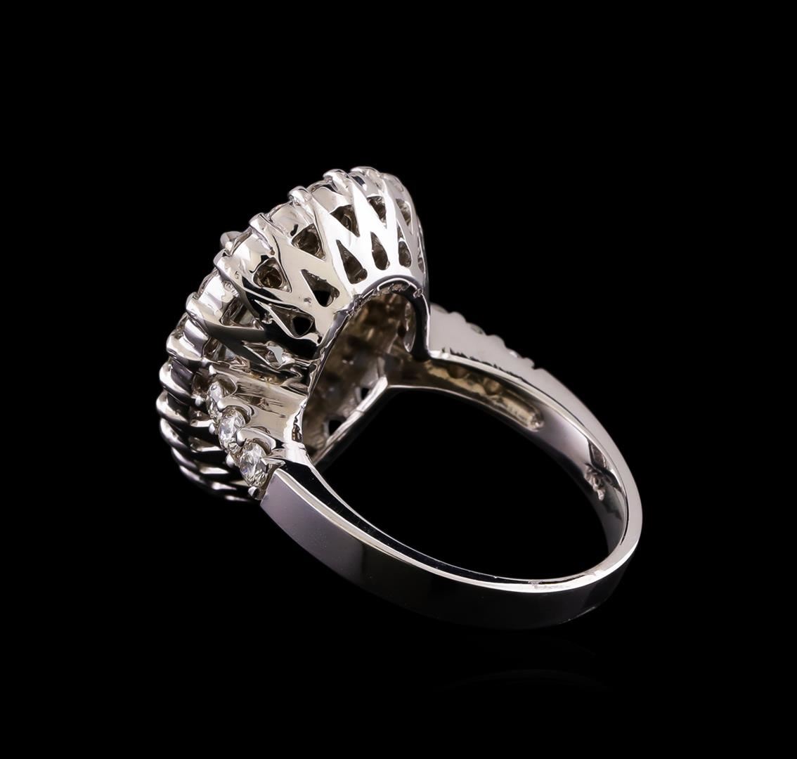 One electronically tested 14KT white gold lady's cast fashion ring with a basket halo with a bright polish finish. The featured lady's ring has a shank measuring 2.75 millimeters wide. Identified with markings of "K14". Condition is new, good workmanship. Containing: One prong set pear modified brilliant cut natural aquamarine, measuring 14.10 x 9.92 x 5.37mm, (depth est.) approximate weight of 4.67ct., clarity is eye clean, light, moderately strong, greenish blue color, (GIA gB 3/4), cut is good. Transmitting light with no distortion, transparent. Colored gemstones are presumed to have been subjected to commonly used enhancement processes. Graded in the setting. Twenty-Seven prong set round brilliant cut diamonds, measuring 2.30 - 2.25 x 1.41mm (depth est.) approximate total weight of 27 Stones = 1.20ct. Graded in the setting. Clarity: VS-2 to SI-1. Color: H - I. Cut Good. Total Weight of Colored Stones 4.67ct. Total Weight of Diamonds 1.20ct. Total Weight of Ring 8.50gm. GAS Appraised at $7,990.00.