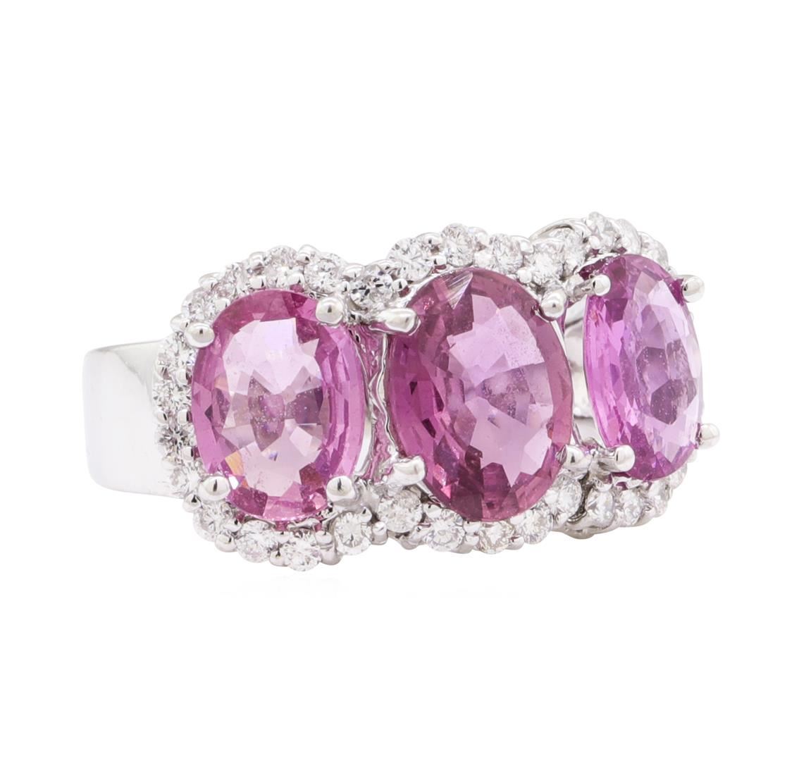 One electronically tested 14KT white gold lady's cast fashion ring with a three stone halo with a bright polish finish. The featured lady's ring has a shank measuring 3.80 millimeters wide. Identified with markings of '14K'. Condition is new, good workmanship. Containing: Three prong set oval modified mixed cut natural pink sapphires, measuring 8.36 x 6.00 x 2.85mm, (depth est.) 15%. bulge factor, approximate total weight of 4.16ct., clarity is slightly included, medium, slightly brownish, strongly purplish red color, (GIA stpR 5/2), cut is good. Transmitting light with a minimum of distortion, transparent. Colored gemstones are presumed to have been subjected to commonly used enhancement processes. Graded in the setting. Thirty-Four prong set round brilliant cut diamonds, measuring 1.60 - 1.55 x 0.98mm (depth est.) approximate total weight of 34 Stones = 0.51ct. Graded in the setting. Color H - I Clarity SI-1 to SI-2 Cut Good. Total Weight of Colored Stones 4.16ct.. Total Weight of Diamonds 0.51ct.. Total Weight of Ring 6.50gm GAS Appraised at $5990.00. GAS Appraised.