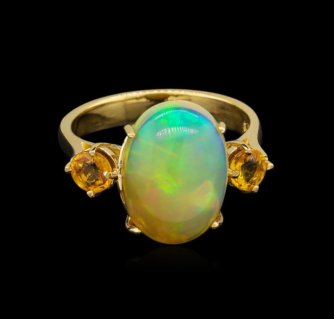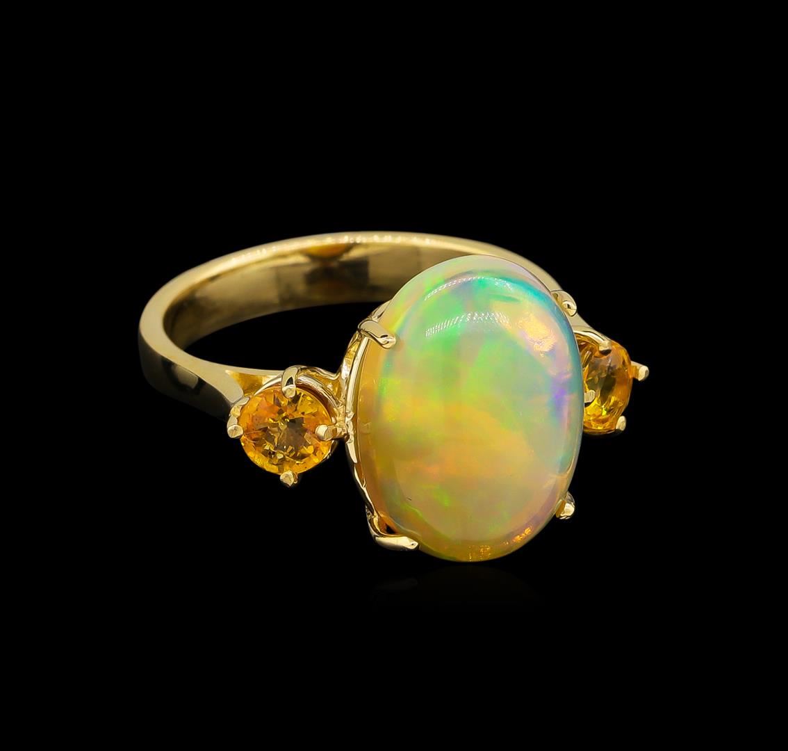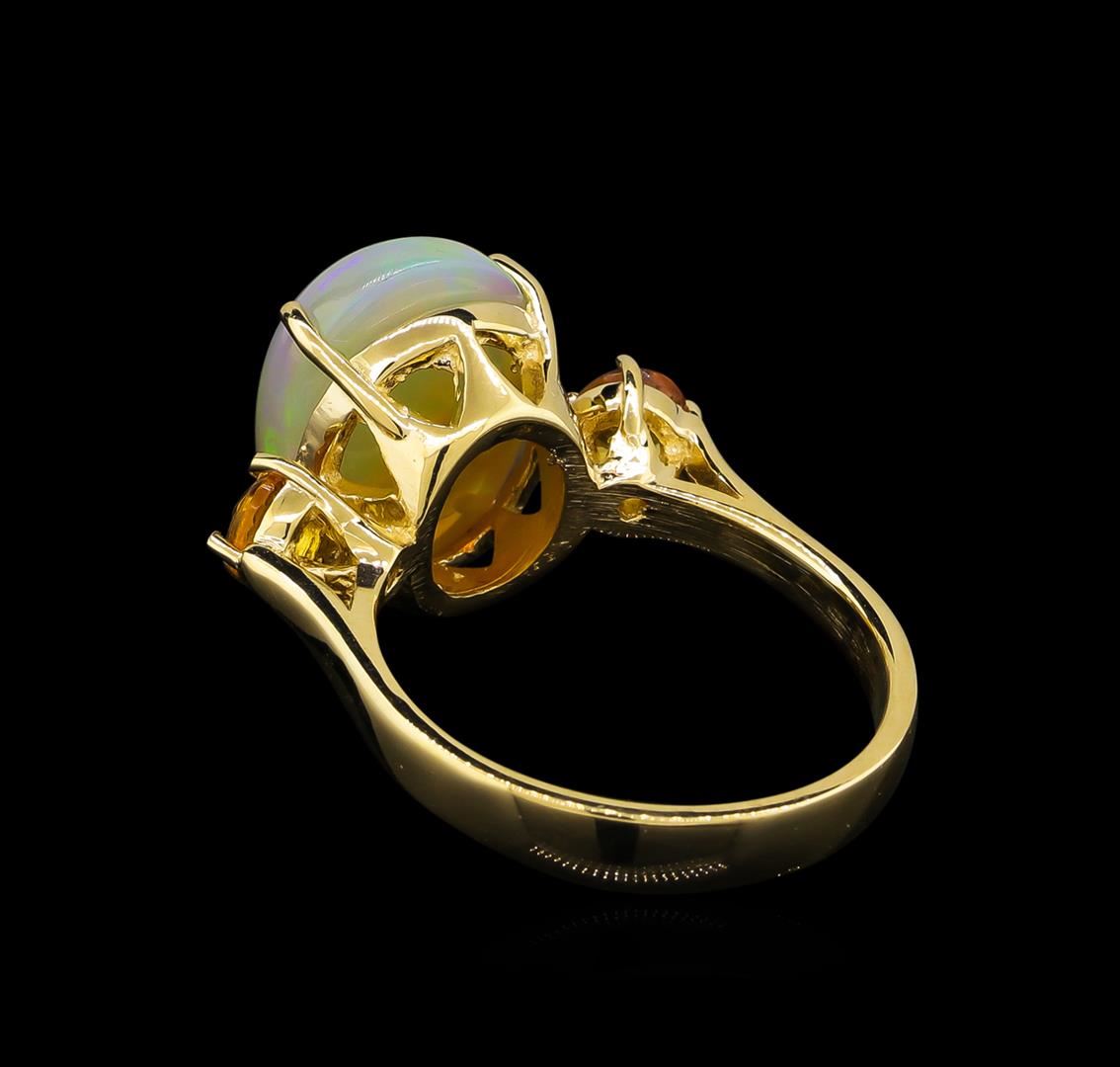 One ring featuring: 14KT yellow gold weighing 4.28 grams containing one opal with a total weight of 3.95ct and two orange sapphires with a total weight of 0.72ct.
