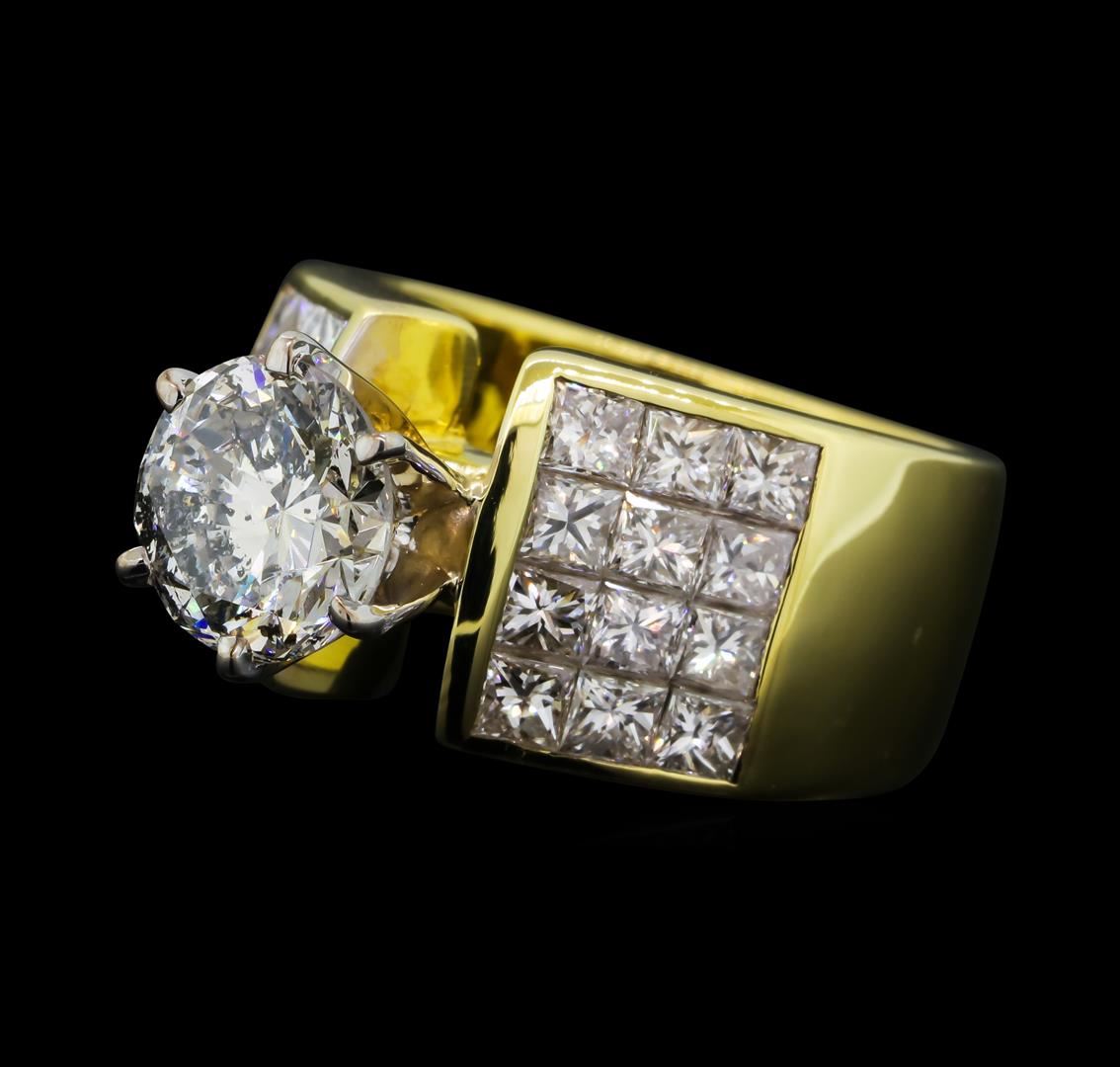 One electronically tested 18KT yellow gold lady's combination cast & assembled wedding ring with a wide band with a bright polish finish. The featured lady's ring has a shank measuring 8.40 millimeters wide. Identified with markings of '18K'. Condition is new, good workmanship. Containing: One prong set round brilliant cut diamond, measuring 8.35 - 8.26 x 4.99mm (depth est.) approximate weight of 2.18ct. Graded in the setting. Clarity I-1. Color: J Cut Good Twenty-Four invisible set princess cut diamonds, measuring 2.60 x 2.50 x 1.88mm (depth est.) approximate total weight of 24 Stones = 2.50ct. Graded in the setting. Clarity VS-2 to SI-2. Color: F - G Cut Very Good. Total Weight of Diamonds 4.68ct.. Total Weight of Ring 17.50gm GAS Appraised at $27,355.00.