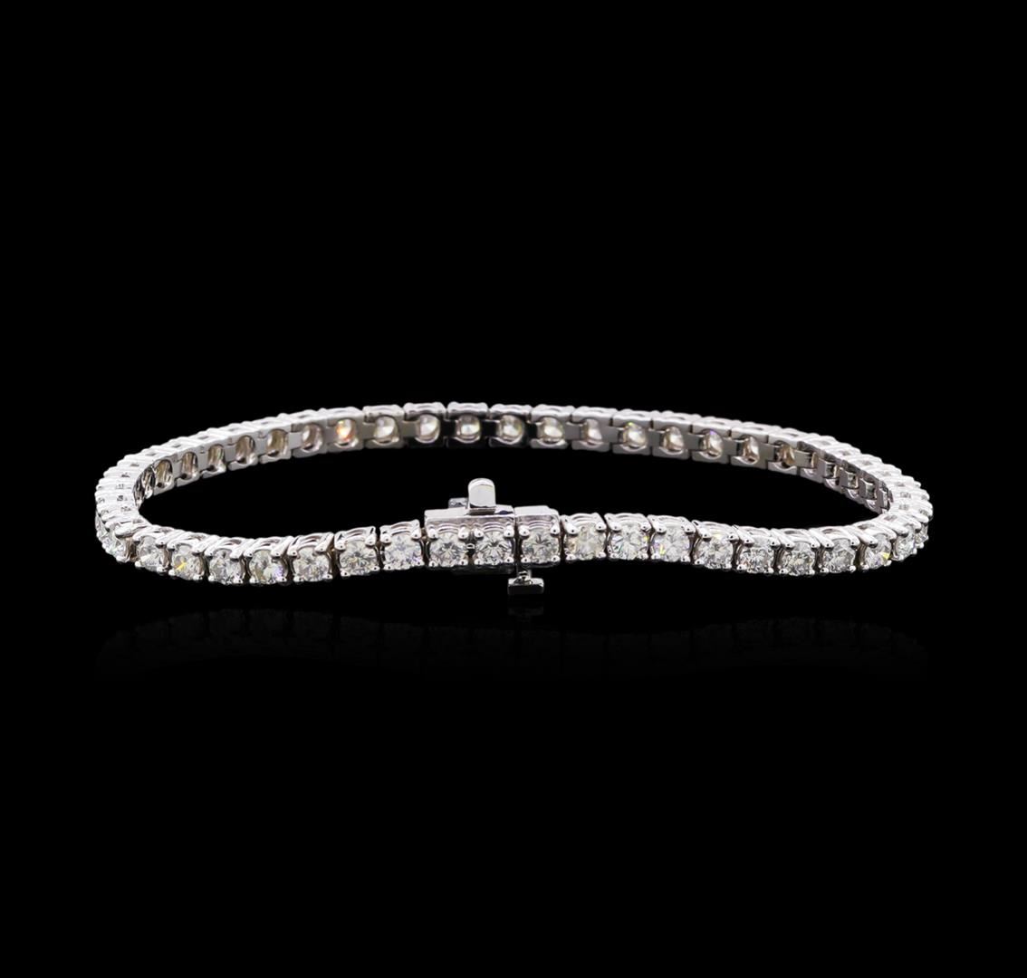 One electronically tested 14KT white gold lady's combination cast & assembled fashion tennis bracelet with a tongue clasp with foldover safety with a bright polish finish. The featured lady's bracelet measures 7 inches in length. Identified with markings of "14K". Condition is new, good workmanship. Containing: Fifty prong set round brilliant cut diamonds, measuring 2.95 - 2.87 x 1.81mm (depth est.) approximate total weight of 50 Stones = 4.68ct. Graded in the setting. Clarity: VS-2 to SI-2. Color: H - Very Good. Total Weight of Diamonds 4.68ct. Total Weight of Tennis Bracelet 13.20gm. GAS Appraised at $14,035.00.