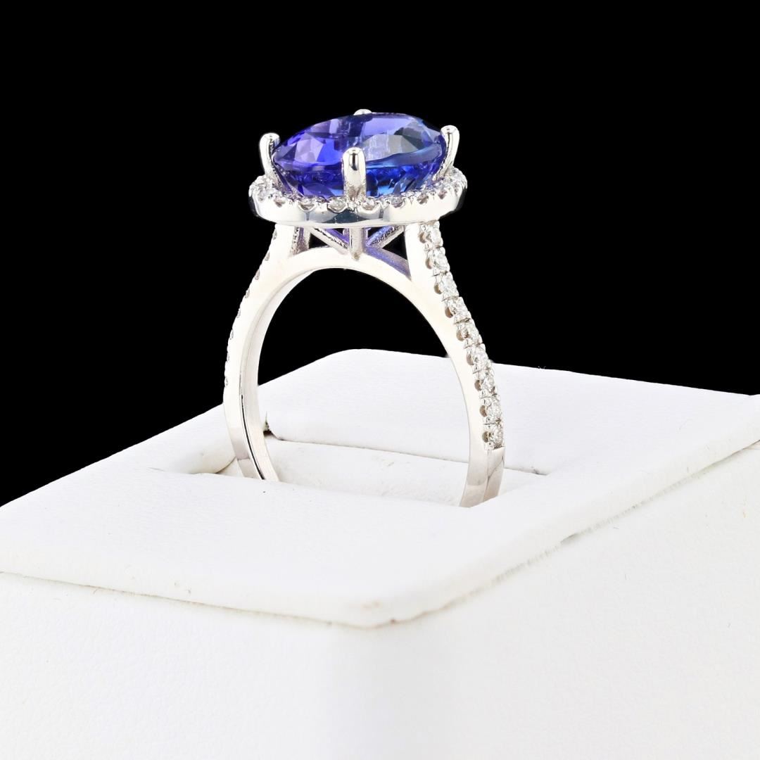 Fourteen karat (14K) white gold natural tanzanite zoisite and diamond ring. An oval cut natural tanzanite zoisite gemstone is mounted in the center of the ring. Round brilliant cut diamonds accent the ring around and on both sides of the center gemstone. The ring has a gross weight of 5.0 Grams: NATURAL GEMSTONE. GEMSTONE: Tanzanite Zoisite NATURE: Natural SHAPE: Oval, Faceted Cut WEIGHT: 4.68 carat total DIMENSIONS: 11.86 x 8.70mm CLARITY: Type 1 COLOR: Violetish Blue (5/5) SYMMETRY: Excellent COLOR INTENSITY: Intense TRANSPARENCY: Transparent TONE: Dark NATURAL DIAMOND SHAPE: Round Brilliant Cut WEIGHT: 0.42 carat total (40pcs.) DIMENSIONS: 1.6 x 1.3mm AVERAGE CLARITY: SI1 to SI2 AVERAGE COLOR: G - H SYMMETRY: Excellent POLISH: Excellent METAL: Gold PURITY: 14K COLOR: White CONDITION: Excellent FINISH: High Polish Size: 6 1/2