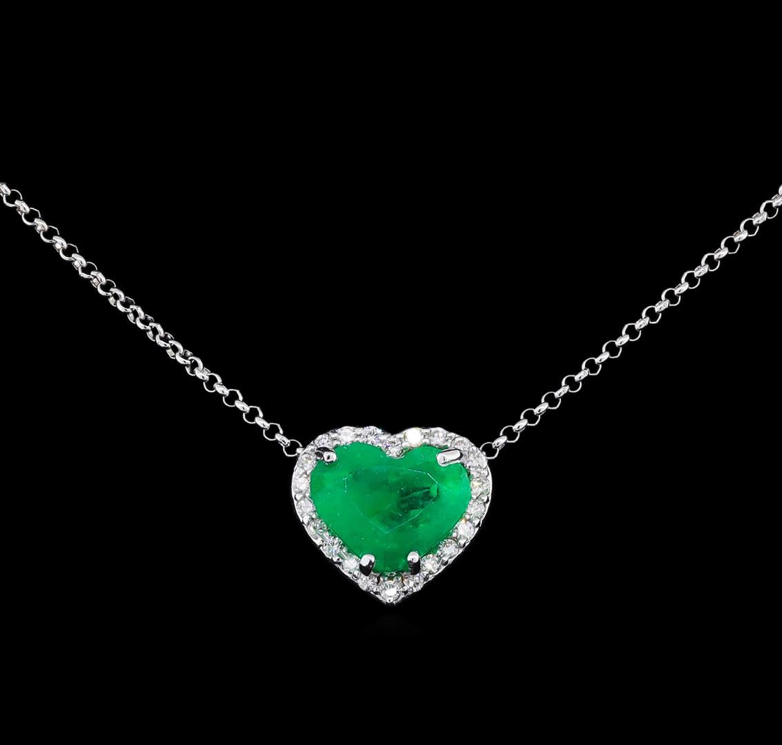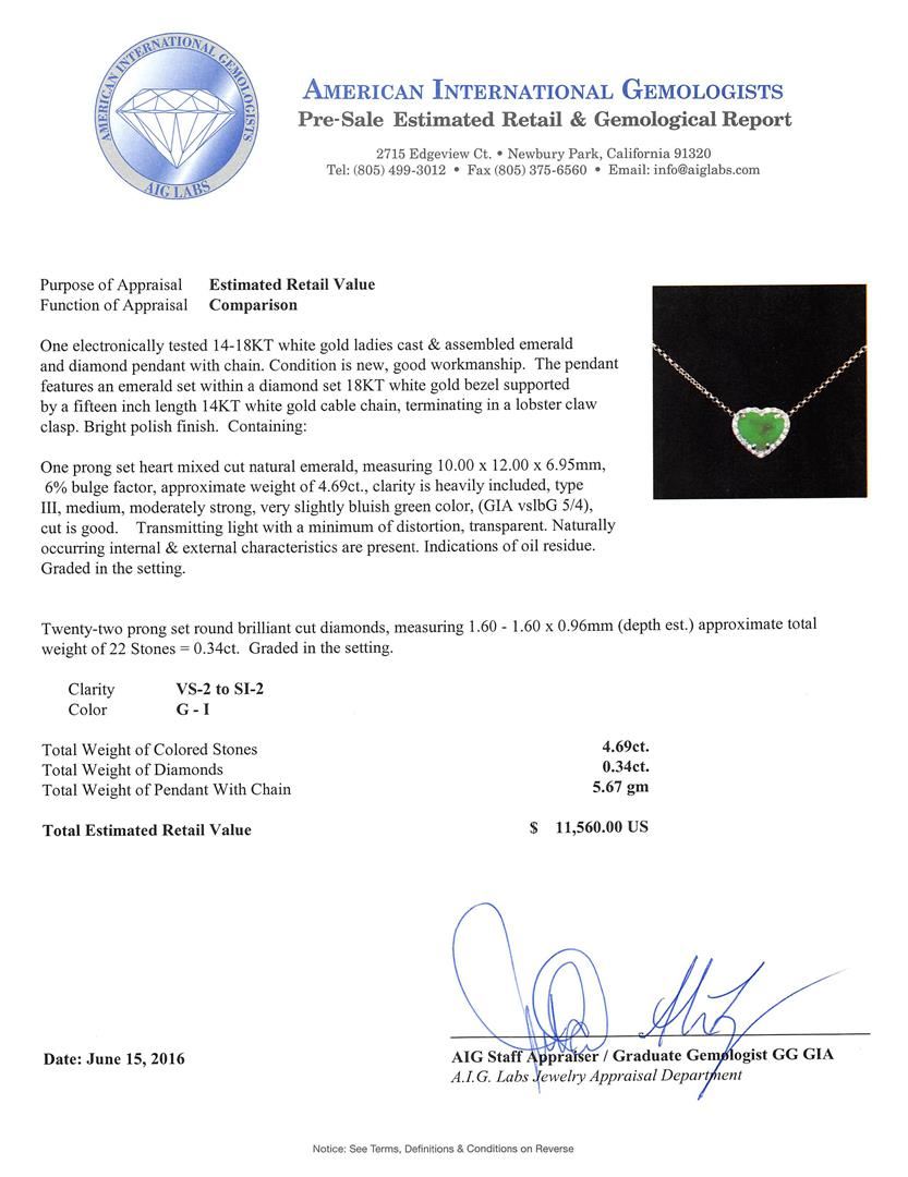 One electronically tested 14-18KT white gold ladies cast & assembled emerald and diamond pendant with chain. The pendant features an emerald set within a diamond set 18KT white gold bezel supported by a fifteen inch length 14KT white gold cable chain, terminating in a lobster claw clasp. Bright polish finish. Condition is new, good workmanship. Containing: One prong set heart mixed cut natural emerald, measuring 10.00 x 12.00 x 6.95mm, 6%. bulge factor, approximate weight of 4.69ct., clarity is heavily included, type III, medium, moderately strong, very slightly bluish green color, (GIA vslbG 5/4), cut is good. Transmitting light with a minimum of distortion, transparent. Naturally occurring internal & external characteristics are present. Indications of oil residue. Graded in the setting. Twenty-Two prong set round brilliant cut diamonds, measuring 1.60 - 1.60 x 0.96mm (depth est.) approximate total weight of 22 Stones = 0.34ct. Graded in the setting. Clarity: VS-2 to SI-2. Color: G - I. Total Weight of Colored Stones 4.69ct. Total Weight of Diamonds 0.34ct. Total Weight of Pendant With Chain 5.67gm. AIG Appraised at $11,560.00.