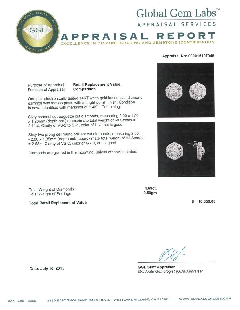 One pair electronically tested 14KT white gold ladies cast diamond earrings with friction posts with a bright polish finish. Identified with markings of "14K". Condition is new. Containing: Sixty channel set baguette cut diamonds, measuring 2.00 x 1.50 x 1.28mm (depth est.) approximate total weight of 60 Stones = 2.11ct. Clarity: VS-2 to SI-1. Color: I - J, Cut is Good. Sixty-Two prong set round brilliant cut diamonds, measuring 2.50 - 2.00 x 1.35mm (depth est.) approximate total weight of 62 Stones = 2.58ct. Clarity: VS-2. Color: G - H, Cut is Good. Diamonds are graded in the mounting, unless otherwise stated. Total Weight of Diamonds 4.69ct. Total Weight of Earrings 9.50 grams. GGL Appraised at $10,050.00.