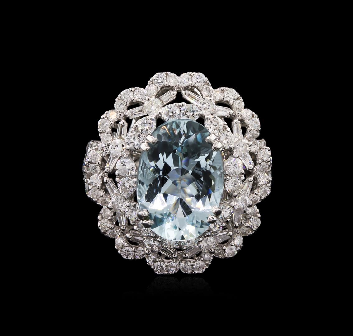 One electronically tested 18KT white gold lady's cast fashion ring with a split shank with a bright polish finish. The featured lady's ring has a scalloped halo motif and a shank measuring 3.45 millimeters wide. Identified with markings of "18K". Condition is new, good workmanship. Containing: One prong set oval modified mixed cut natural aquamarine, measuring 13.82 x 9.81 x 6.10mm, approximate weight of 4.70ct., clarity is eye clean, type I, medium light, very slightly grayish, very slightly greenish blue color, (GIA vslgB 4/3), cut is very good. Colored gemstones are presumed to have been subjected to commonly used enhancement processes. Graded in the setting. Twenty-Six prong set round brilliant cut diamonds, measuring 2.30 - 2.20 x 1.42mm (depth est.) approximate total weight of 26 Stones = 1.14ct. Graded in the setting. Clarity: SI-2 to I-1. Color: G - I. Cut Good Sixteen prong set baguette cut (tapered) diamonds, measuring from 1.60 x 0.70 x 0.60mm (depth est.) to 1.70 x 1.20 x 1.02mm (depth est.) approximate total weight of 16 Stones = 0.18ct. Graded in the setting. Clarity: SI-1 to SI-2. Color: G - Good Seventy-Six prong set round brilliant cut diamonds, measuring 1.70 - 1.50 x 0.96mm (depth est.) approximate total weight of 76 Stones = 1.11ct. Graded in the setting. Clarity: SI-2 to I-1. Color: G - I. Cut Good. Total Weight of Colored Stones 4.70ct. Total Weight of Diamonds 2.43ct. Total Weight of Ring 8.30gm. GAS Appraised at $10,505.00.