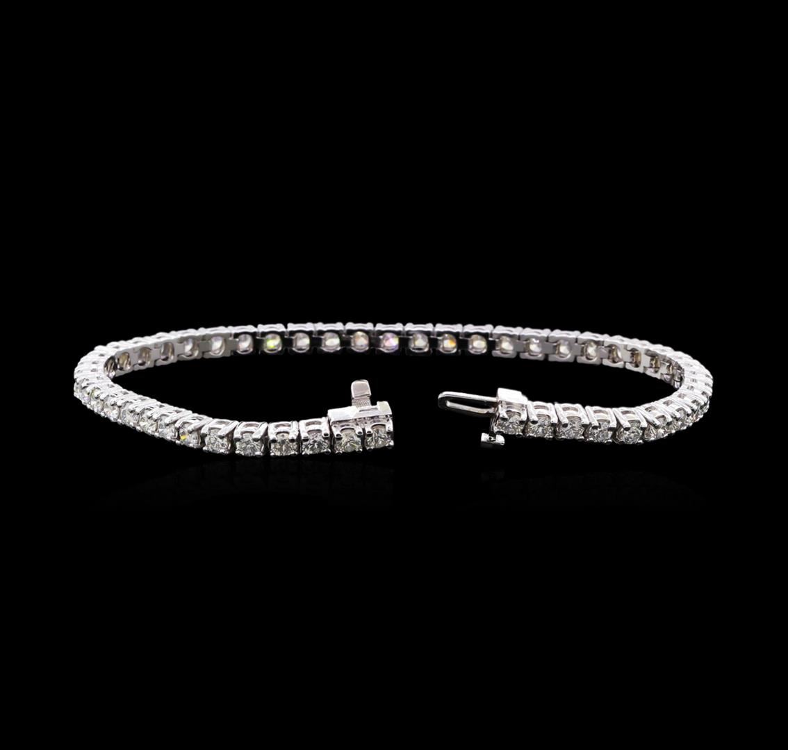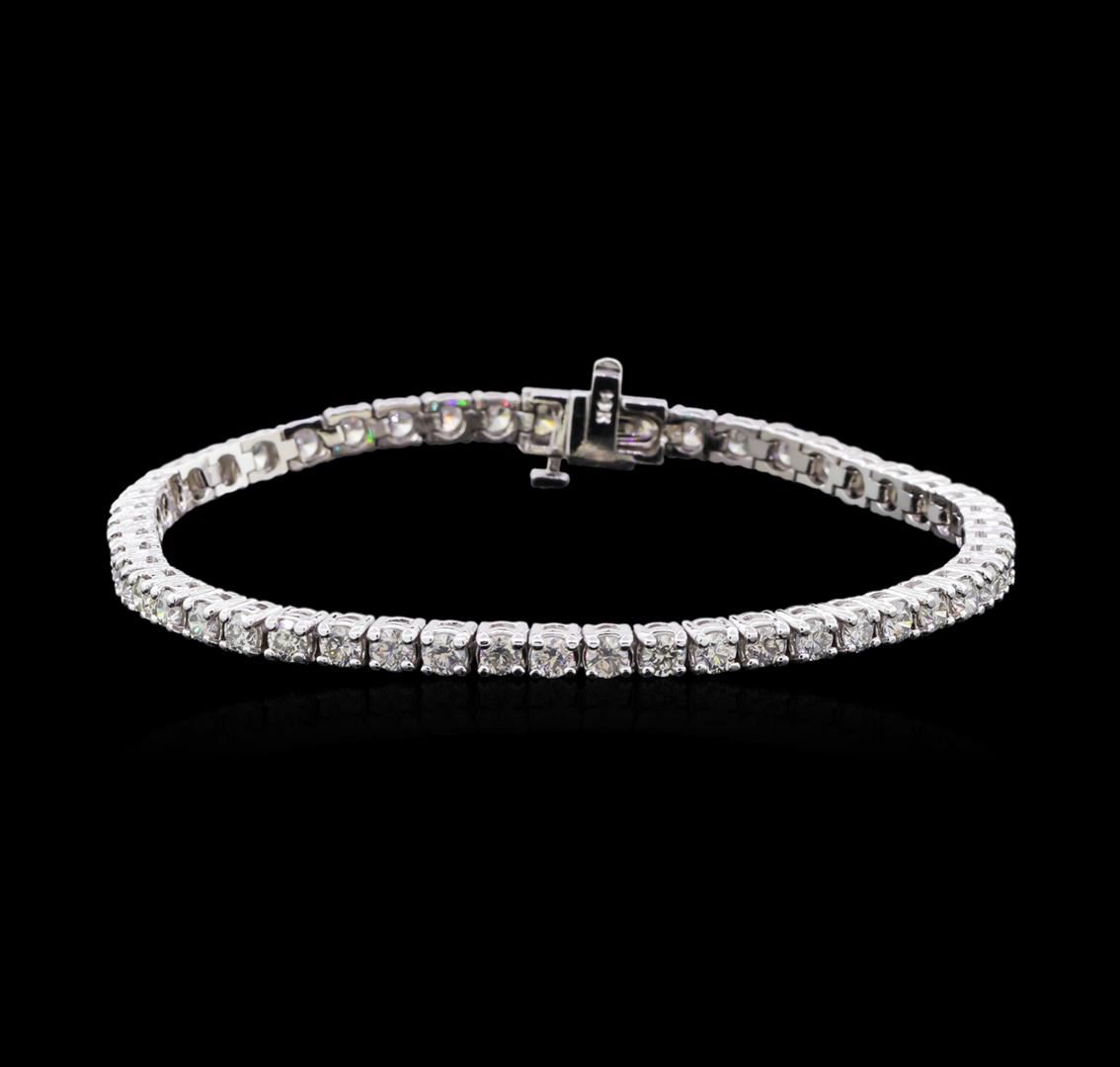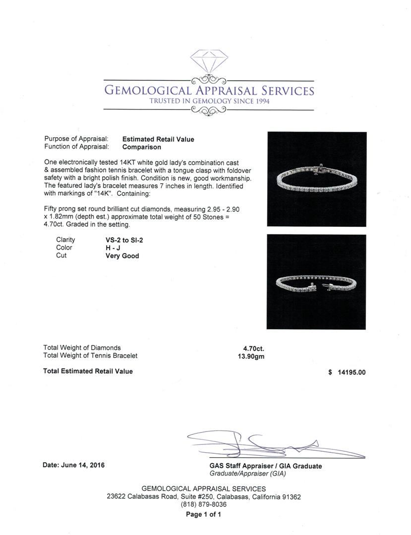 One electronically tested 14KT white gold lady's combination cast & assembled fashion tennis bracelet with a tongue clasp with foldover safety with a bright polish finish. The featured lady's bracelet measures 7 inches in length. Identified with markings of "14K". Condition is new, good workmanship. Containing: Fifty prong set round brilliant cut diamonds, measuring 2.95 - 2.90 x 1.82mm (depth est.) approximate total weight of 50 Stones = 4.70ct. Graded in the setting. Clarity: VS-2 to SI-2. Color: H - Very Good. Total Weight of Diamonds 4.70ct. Total Weight of Tennis Bracelet 13.90gm. GAS Appraised at $14,195.00.